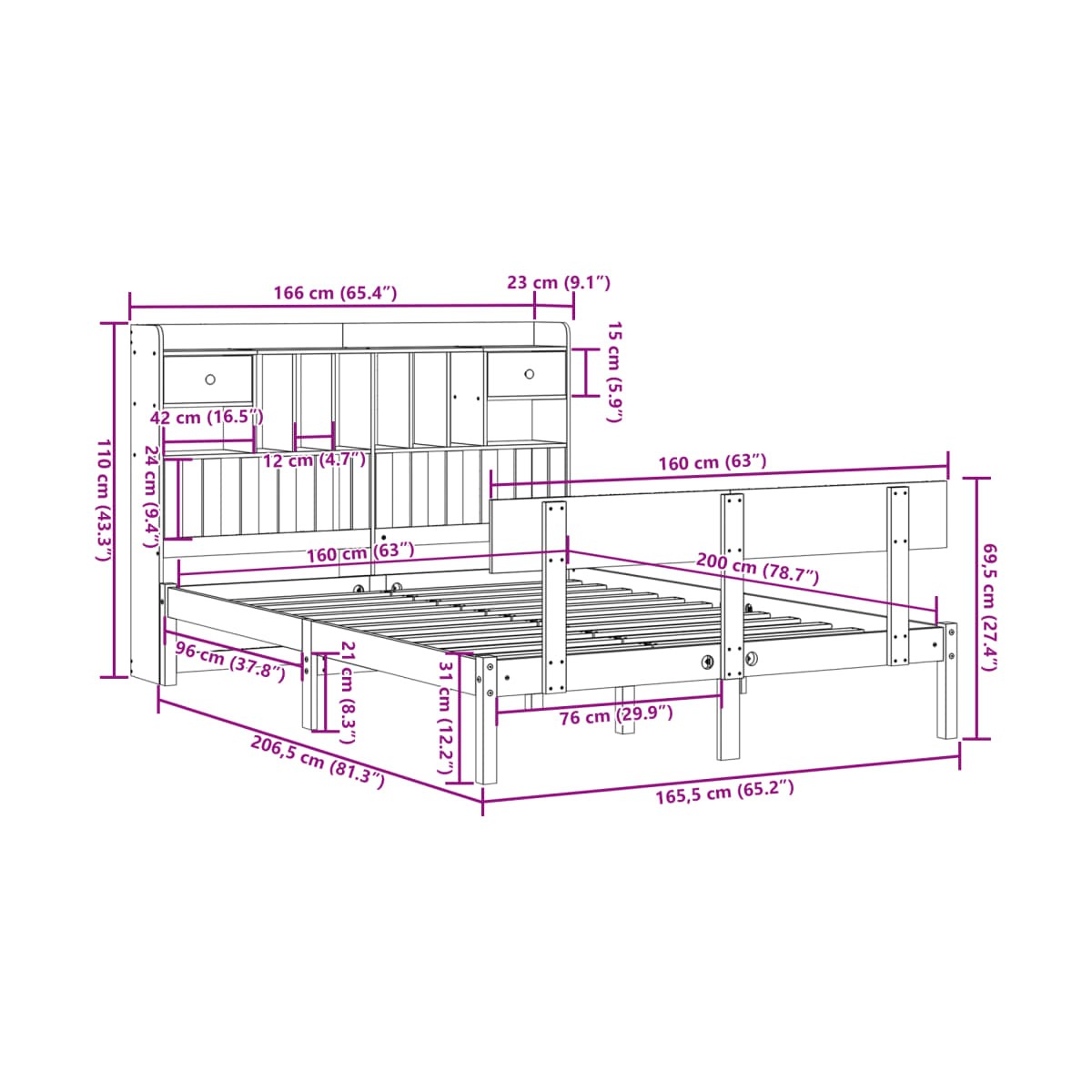- Dimensiones: 166 x 23 x 110 cm (ancho x profundo x alto)