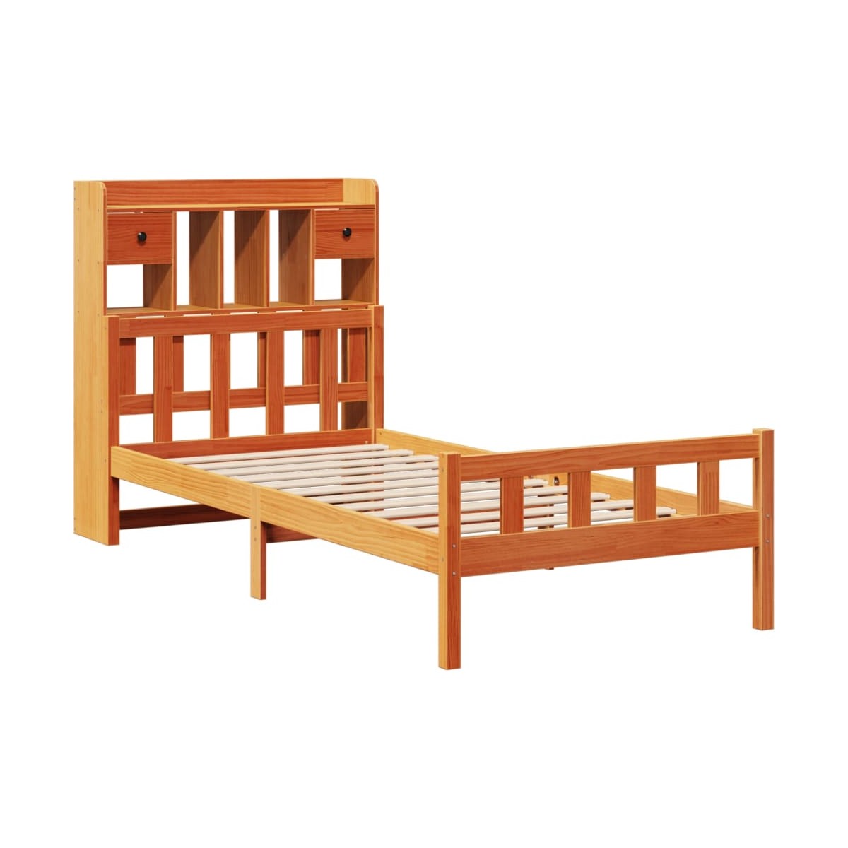 ¡Consigue una mejor noche de sueño reparador con esta cama con estantería! Es un aporte acogedor para cualquier dormitorio. Estructura estable y duradera: La madera de pino maciza es conocida por su resistencia y durabilidad. Sus vetas rectas y sus característicos nudos contribuyen a su encanto rústico.Somier de láminas para un soporte óptimo: La estructura de cama está equipada con un somier de láminas para el apoyo y la transpirabilidad del colchón.Amplio espacio de almacenamiento: El cabecero de estantería ofrece un amplio espacio de almacenamiento para mantener libros, artículos decorativos o pertenencias personales al alcance de la mano, lo que reduce el desorden en el dormitorio.Práctico pie de cama: El pie de cama no solo contribuye a la estabilidad general del marco de la cama, proporcionando un entorno seguro para dormir, sino que también asegura su colchón en su lugar y evita que las mantas, sábanas y otra ropa de cama se caigan del extremo de la cama, manteniendo una apariencia ordenada.Ahorro de espacio: Este cabecero es una opción de ahorro de espacio que puede sustituir la necesidad de una mesilla de noche, ayudando a maximizar el espacio de tu dormitorio, y haciéndolo ideal para espacios pequeños o limitados. Información útil:El colchón no está incluido con la cama. Disponemos de una variada selección de colchones. Puedes echar un vistazo a nuestra tienda para buscar el colchón correspondiente.
