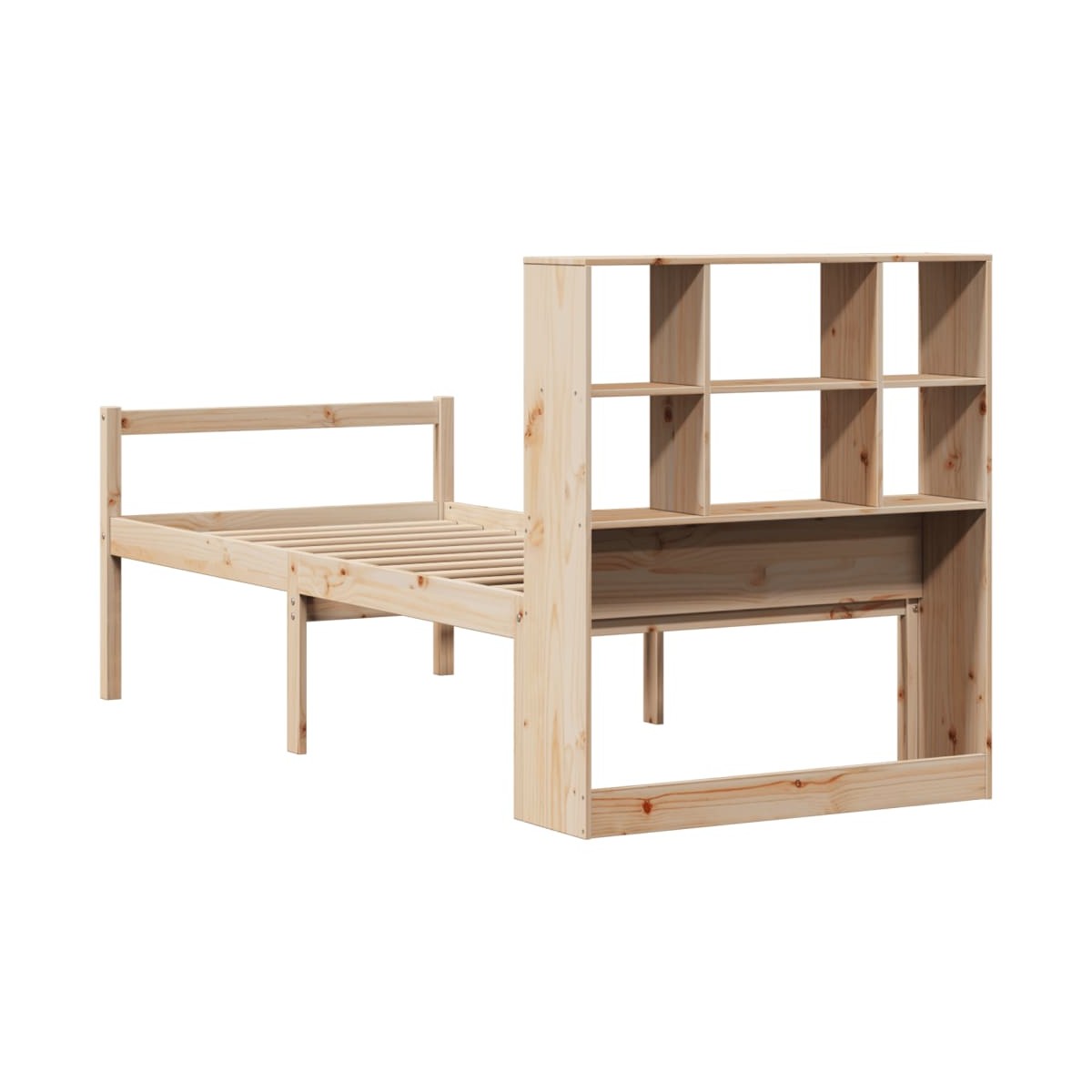 ¡Consigue una mejor noche de sueño reparador con esta cama con estantería! Es un aporte acogedor para cualquier dormitorio. Estructura estable y duradera: La madera de pino maciza es conocida por su resistencia y durabilidad. Sus vetas rectas y sus característicos nudos contribuyen a su encanto rústico.Somier de láminas para un soporte óptimo: La estructura de cama está equipada con un somier de láminas para el apoyo y la transpirabilidad del colchón.Amplio espacio de almacenamiento: El cabecero de estantería ofrece un amplio espacio de almacenamiento para mantener libros, artículos decorativos o pertenencias personales al alcance de la mano, lo que reduce el desorden en el dormitorio.Práctico pie de cama: El pie de cama no solo contribuye a la estabilidad general del marco de la cama, proporcionando un entorno seguro para dormir, sino que también asegura su colchón en su lugar y evita que las mantas, sábanas y otra ropa de cama se caigan del extremo de la cama, manteniendo una apariencia ordenada.Ahorro de espacio: Este cabecero es una opción de ahorro de espacio que puede sustituir la necesidad de una mesilla de noche, ayudando a maximizar el espacio de tu dormitorio, y haciéndolo ideal para espacios pequeños o limitados. Información útil:El colchón no está incluido con la cama. Disponemos de una variada selección de colchones. Puedes echar un vistazo a nuestra tienda para buscar el colchón correspondiente.