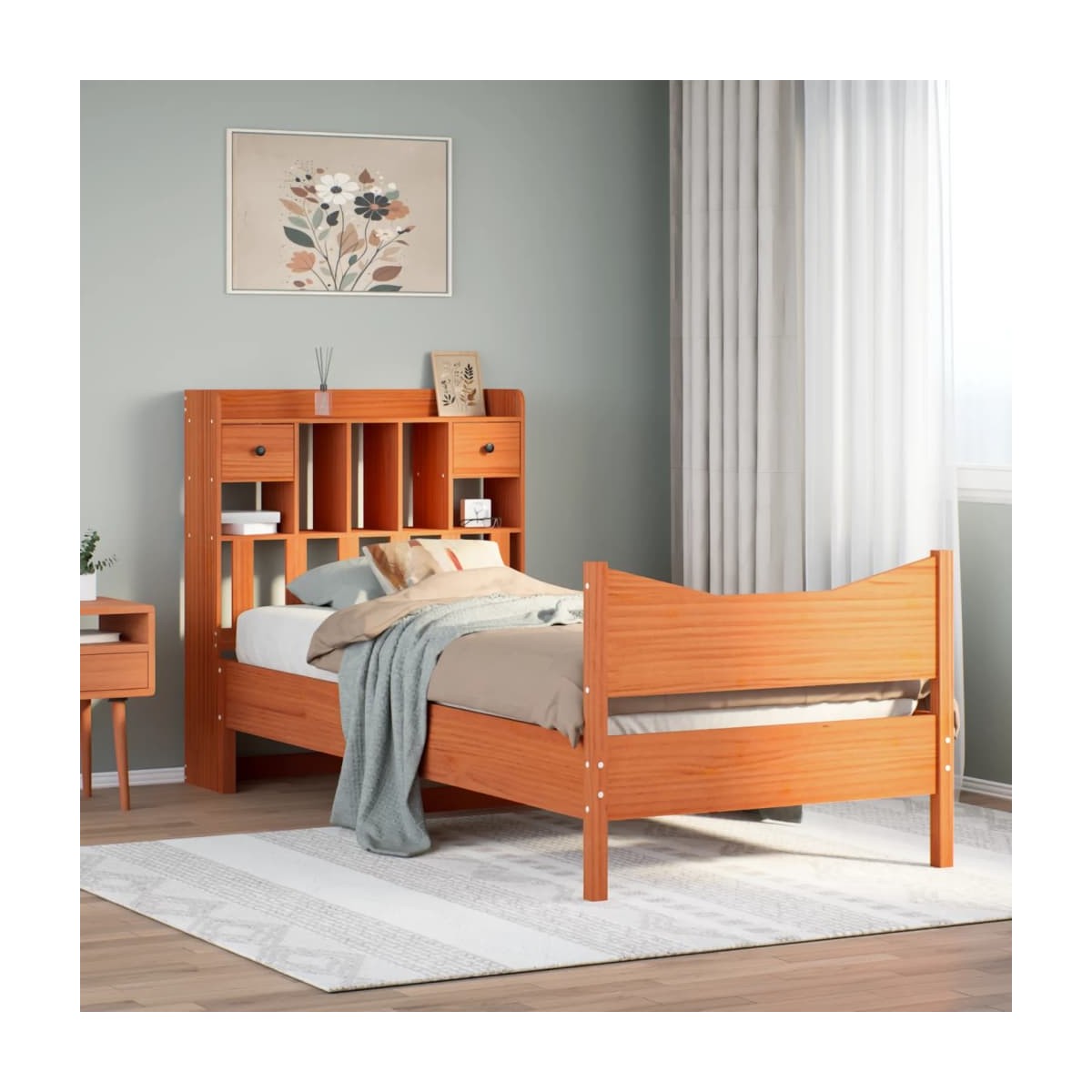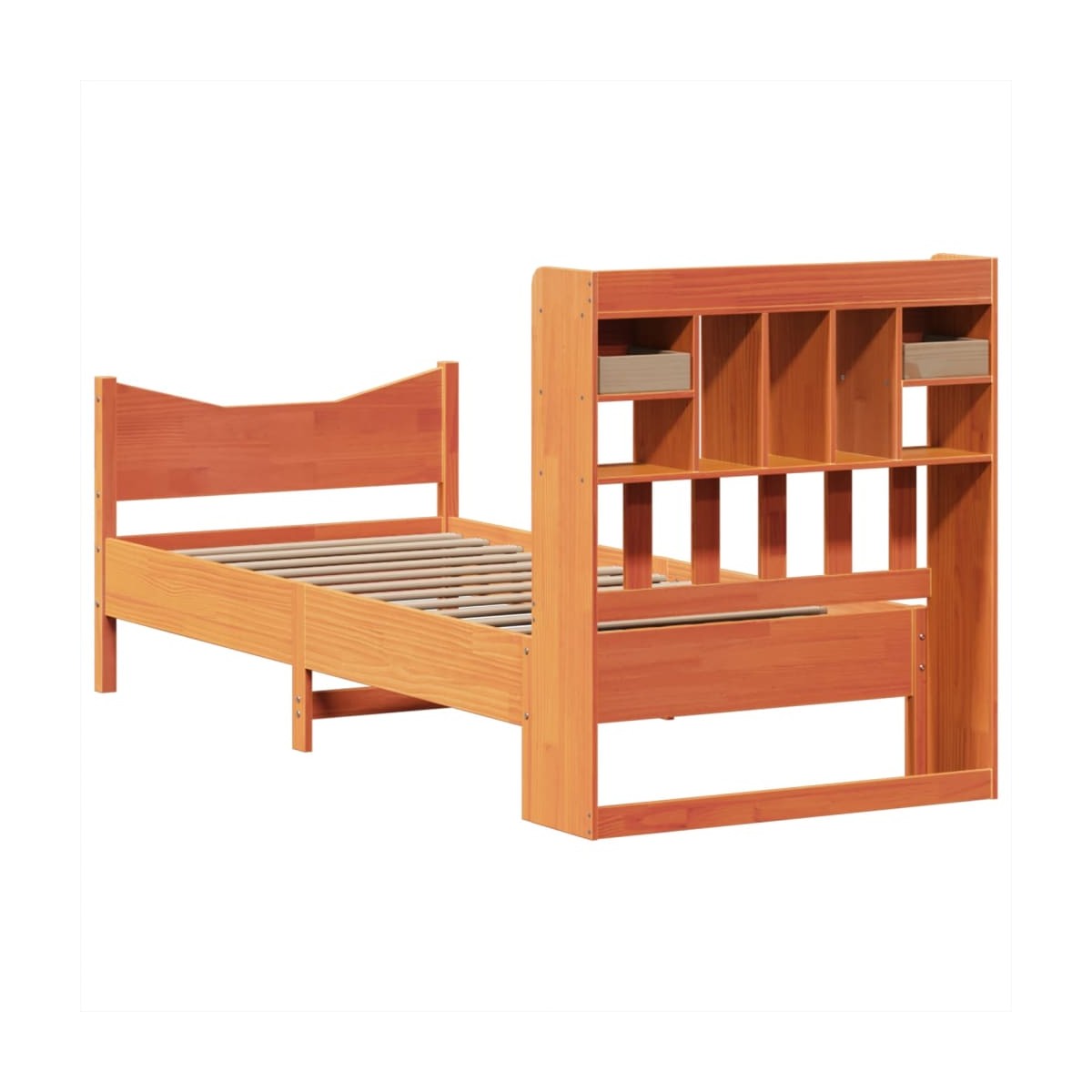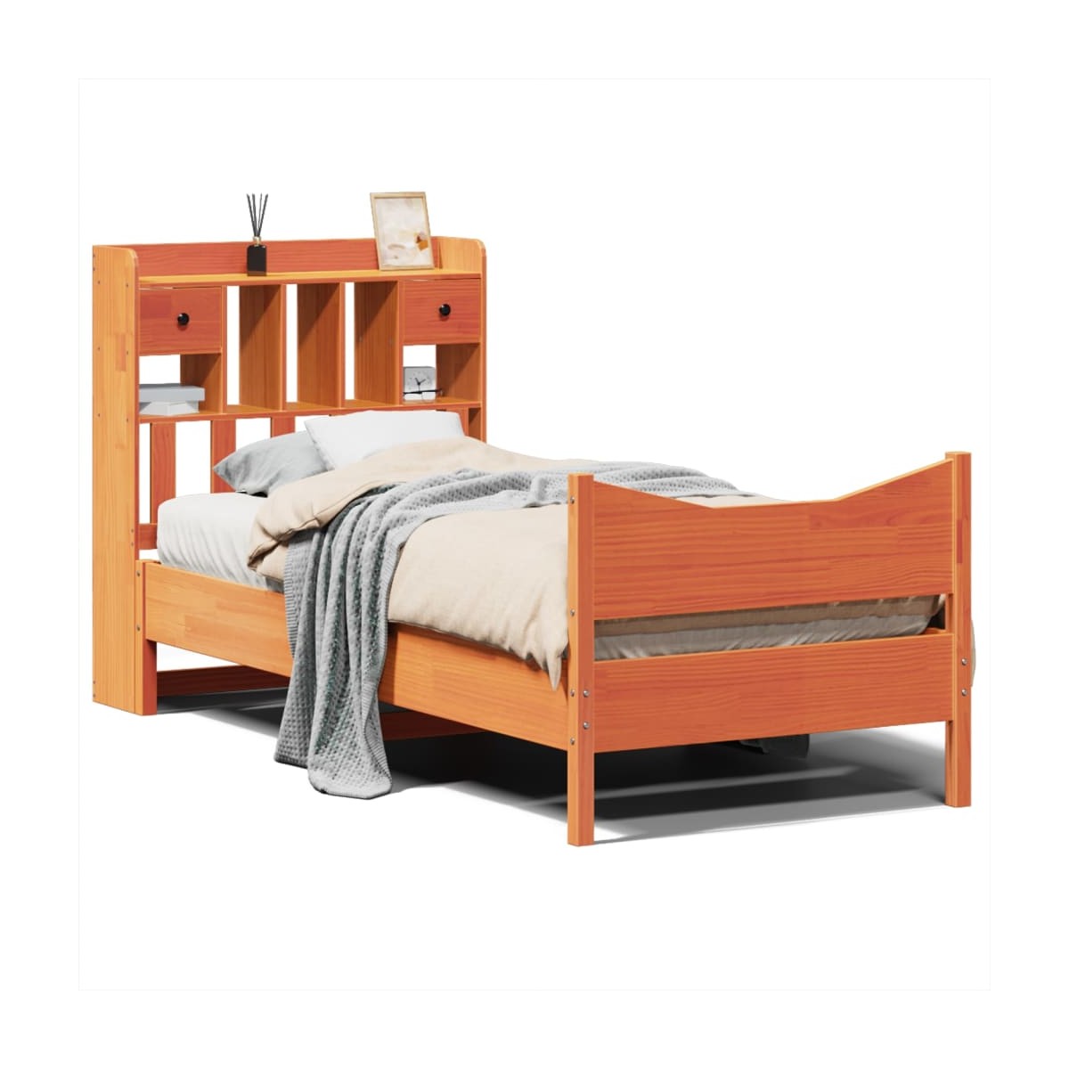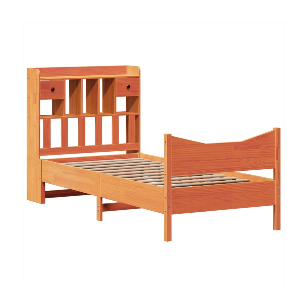 Consigue un sueño más reparador con esta estructura de cama. Es un aporte acogedor para cualquier dormitorio. Estructura estable y duradera: La madera de pino maciza es conocida por su resistencia y durabilidad. Sus vetas rectas y sus característicos nudos contribuyen a su encanto rústico.Somier de láminas para un soporte óptimo: El base de cama está equipado con un somier de láminas para el apoyo y la transpirabilidad del colchón.Espacio de almacenamiento extra: Este elegante cabecero cuenta con 6 prácticos compartimentos y 2 cajones, lo que ofrece un amplio espacio de almacenamiento para mantener todos los elementos esenciales de la noche al alcance de la mano. Para mayor comodidad, la cama de madera tiene un espacio adicional debajo para mantener tus cajas de almacenamiento fuera de la vista.Patas estables y duraderas: Este somier está sostenido por patas resistentes, lo que garantiza estabilidad, seguridad y firmeza.Cabecero y estribo de cama funcionales: El cabecero y el estribo de cama mantienen el colchón en su lugar. Además, la cabecera te brinda un excelente soporte para la espalda mientras estás sentado leyendo o mirando la televisión. Información útil:El colchón no está incluido con la cama. Disponemos de una variada selección de colchones. Puedes echar un vistazo a nuestra tienda para buscar el colchón correspondiente.