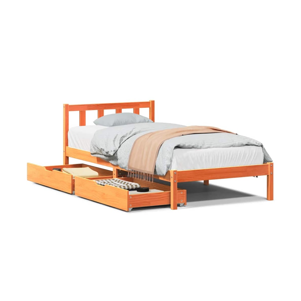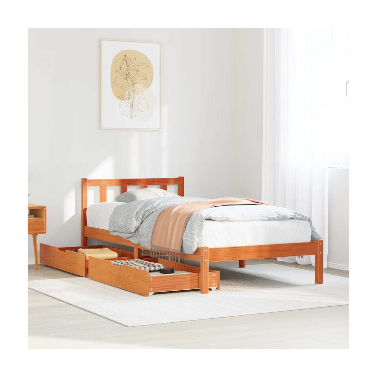 Consigue un sueño más reparador con esta estructura de cama. Es un aporte acogedor para cualquier dormitorio. Estructura estable y duradera: La madera de pino maciza es conocida por su resistencia y durabilidad. Sus vetas rectas y sus característicos nudos contribuyen a su encanto rústico.Somier de láminas para un soporte óptimo: La estructura de cama está equipada con un somier de láminas para el apoyo y la transpirabilidad del colchón.Aprovecha al máximo el espacio: Esta estructura de cama cuenta con dos cajones debajo, que proporcionan almacenamiento para artículos como ropa de cama extra, ropa de temporada y juguetes.Maniobrabilidad sin esfuerzo: Este cajón de almacenamiento bajo la cama cuenta con cuatro ruedas, que proporcionan una maniobrabilidad suave y sin esfuerzo para deslizarse dentro y fuera de debajo de tu cama. Información útil:El colchón no está incluido con la cama. Disponemos de una variada selección de colchones. Puedes echar un vistazo a nuestra tienda para buscar el colchón correspondiente.