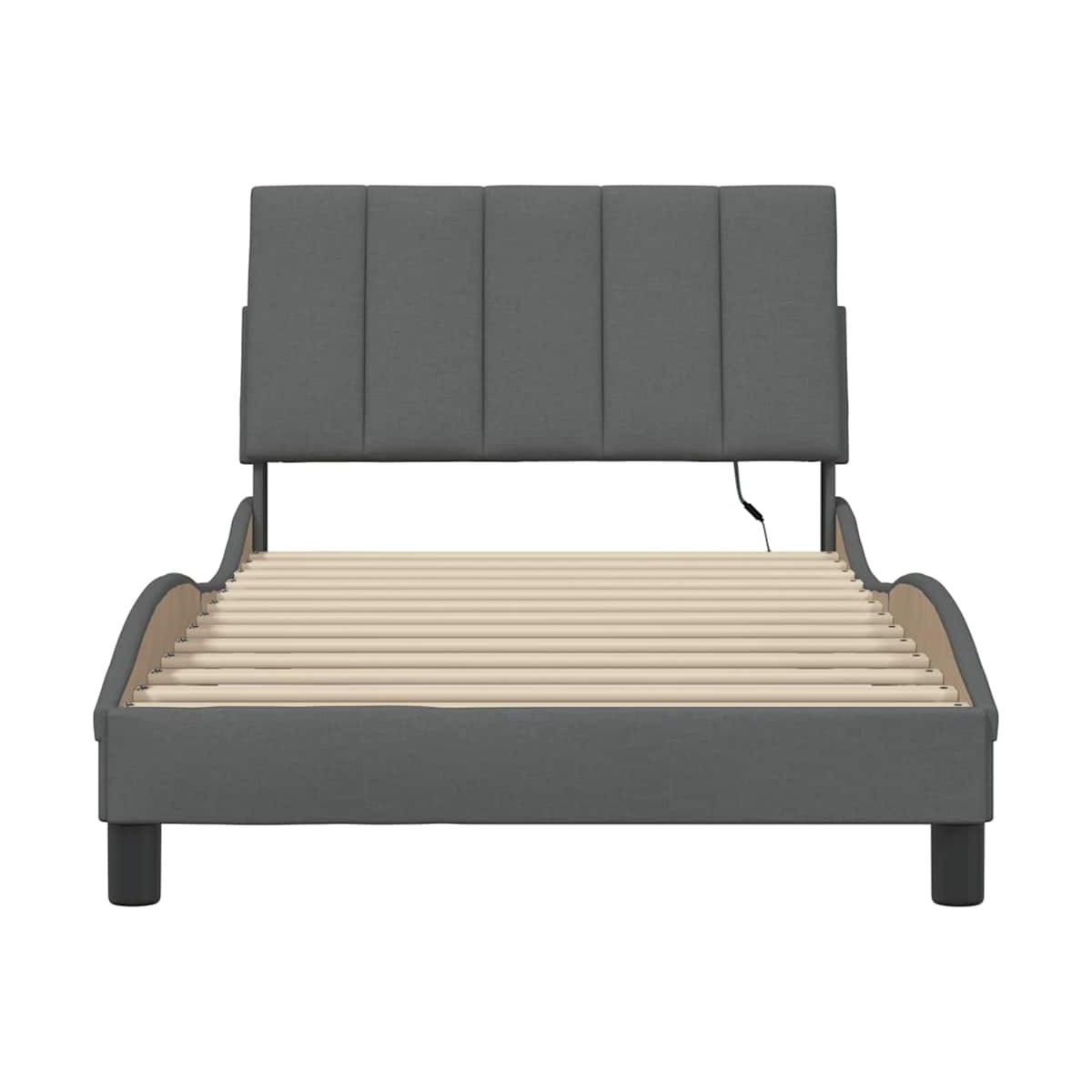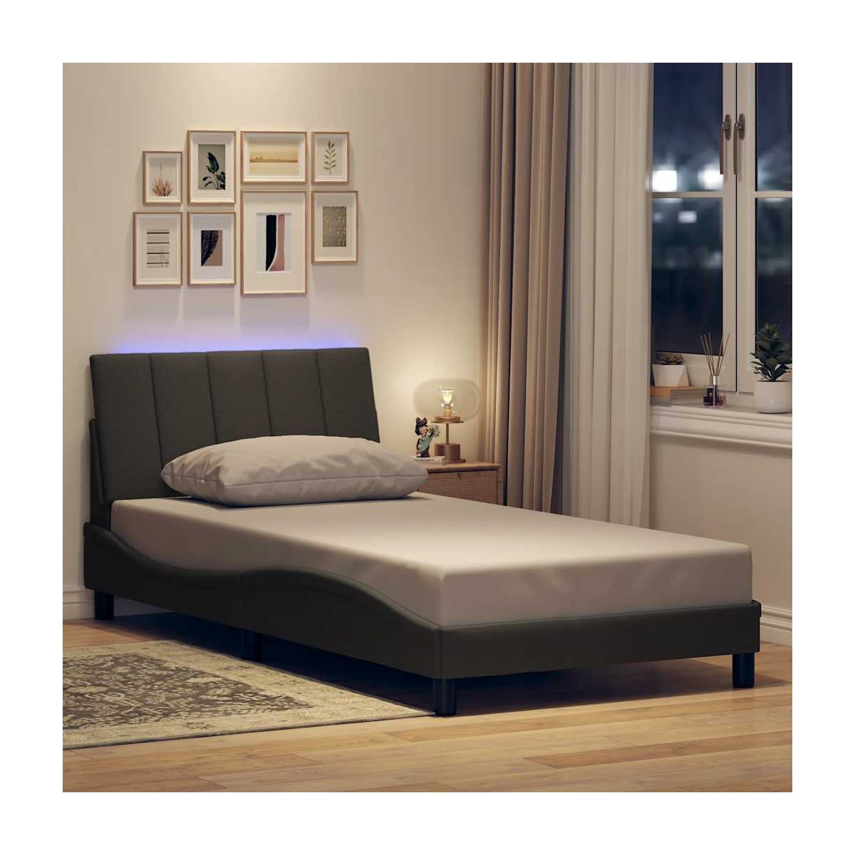 ¡Disfrute de una noche de sueño reparador con este marco de cama con cojín en la cabecera! Es un complemento acogedor para cualquier dormitorio. Material de primera calidad: La tela posee un aspecto sencillo y limpio, y es transpirable y duradera.Patas de apoyo: La cama se apoya en patas robustas, que garantizan su estabilidad, seguridad y firmeza.Listones robustos: Los listones de madera contrachapada proporcionan una buena distribución del peso, lo que garantiza que el colchón se mantenga en tu sitio con cada giro y vuelta del cuerpo mientras duermes.Excelente soporte: El cabecero acolchado está relleno de fibra PP para una comodidad ultrasuave y óptima, lo que te brinda un excelente soporte para la espalda mientras estás sentado en la cama para leer o ver la televisión.Luces LED para un ambiente agradable: Esta cama cuenta con luces LED que se pueden ajustar fácilmente para crear un espectáculo de luces personalizado. Puedes personalizar los modos, los colores y el brillo para mejorar el ambiente de tu espacio interior. Información útil:El colchón no está incluido con la cama. Ofrecemos una variada selección de colchones. Puedes echar un vistazo a nuestra tienda para buscar el colchón correspondiente.El producto tiene un conector USB que necesita una fuente de alimentación USB certificada de 5 V (no incluida).Únicamente puedes cortar por la parte con el símbolo de las tijeras y únicamente la parte con el USB seguirá funcionando como antes.