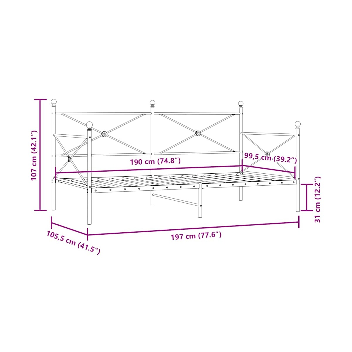 - Dimensiones: 197 x 105,5 x 107 cm (largo x ancho x alto)