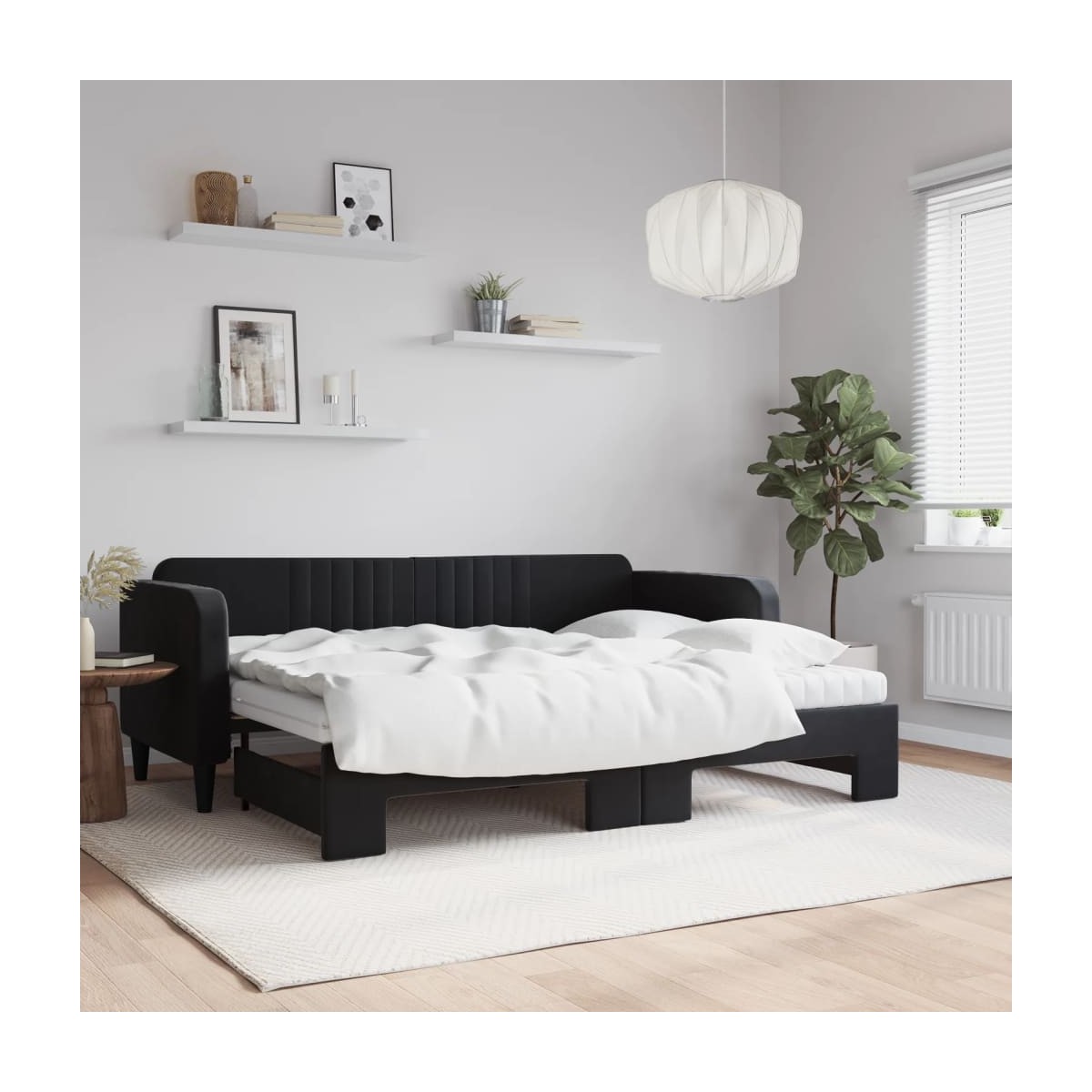 Este sofá cama 2 en 1 con cama nido, que sirve como sofá y cama, es un complemento práctico y llamativo para tu salón o dormitorio. Sofá cama versátil: El sofá cama funciona como sofá durante el día y se convierte fácilmente en una cama doble por la noche sacando la cama nido, lo que proporciona una solución práctica para recibir invitados y maximizar el espacio.Cómodo colchón de espuma: Esta cama se suministra con dos colchones de espuma para un máximo apoyo y una comodidad óptima.Terciopelo suave y construcción sólida: Este sofá cama tiene una estructura resistente hecha de madera y metal y está tapizado en terciopelo suave y cómodo.Diseño moderno: ¡El sofá cama tiene un diseño moderno con líneas nítidas, un aspecto minimalista, así como luz natural, y añadirá un estilo moderno a la casa!