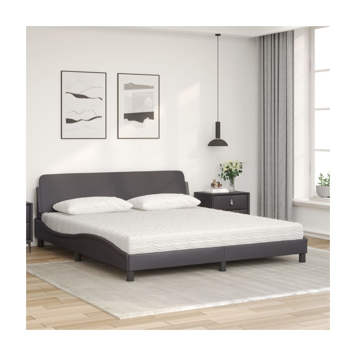¡Consigue tener un sueño más reparador en esta cama con colchón! Es un aporte acogedor para cualquier dormitorio. Material duradero: El cuero sintético de primera calidad es un material muy duradero. Es resistente a las manchas, por lo que es fácil de limpiar con un paño húmedo. Además, la superficie lisa da un aspecto lujoso y la belleza del cuero auténtico.Listones robustos: Los listones de madera contrachapada proporcionan una buena distribución del peso, lo que garantiza que el colchón se mantenga en tu sitio con cada giro y vuelta del cuerpo mientras duermes.Excelente apoyo: El cabecero de la cama te proporciona un excelente apoyo para la espalda mientras estás sentado en la cama para leer o ver la televisión.Colchón de espuma: Este colchón de cama de tela de 3 capas está relleno de espuma de PU 22D para ofrecer un confort óptimo. Alivia el cansancio y favorece la circulación sanguínea, con el fin de ofrecerte una relajación completa y una buena calidad de sueño. Además, el colchón está disponible en dureza H2 y H3, por lo que solo tienes que girarlo para elegir la dureza que más te convenga.Diseño lateral ondulado: El look ondulado de la estructura de la cama es elegante y sofisticado, agregando un toque moderno y elegante a tu decoración, convirtiéndolo en el foco de atención de tu dormitorio.