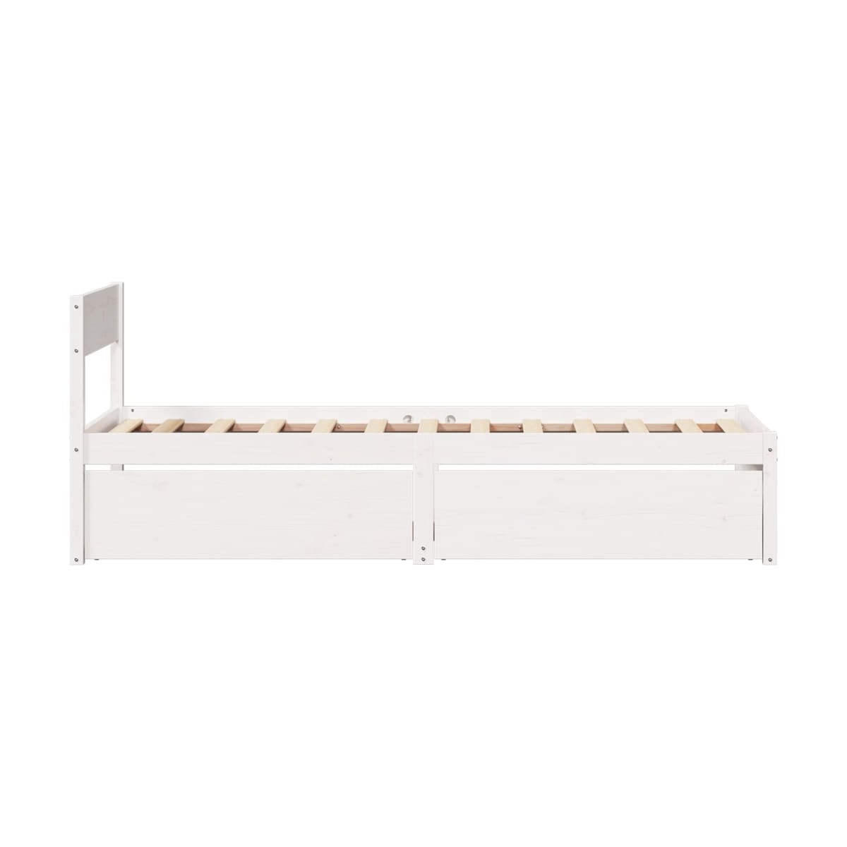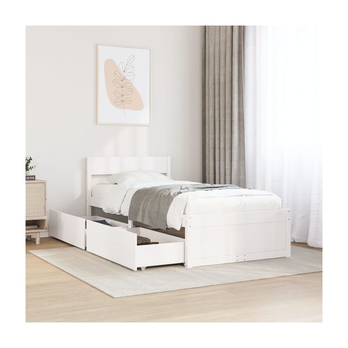 ¡Añade un toque moderno a tu dormitorio con esta estructura de cama con cajones! Es un aporte práctico y decorativo para tu hogar. Estructura estable y duradera: La madera de pino maciza es conocida por su resistencia y durabilidad. Sus vetas rectas y sus característicos nudos contribuyen a su encanto rústico.Listones robustos: Los listones de madera contrachapada proporcionan una buena distribución del peso, lo que garantiza que el colchón se mantenga en tu sitio con cada giro y vuelta del cuerpo mientras duermes.Función de almacenaje: Los cajones de cama incluidos proporcionan amplio espacio de almacenamiento para guardar cosas básicas, y mantienen la habitación limpia y ordenada.Cabecero versátil: Esta estructura de cama viene con un cabecero que proporciona un excelente soporte para la espalda cuando te sientas en la cama para leer o ver la televisión, a la vez que sirve como elemento decorativo. Información útil:El colchón no está incluido con la cama. Disponemos de una variada selección de colchones. Puedes echar un vistazo a nuestra tienda para buscar el colchón correspondiente.