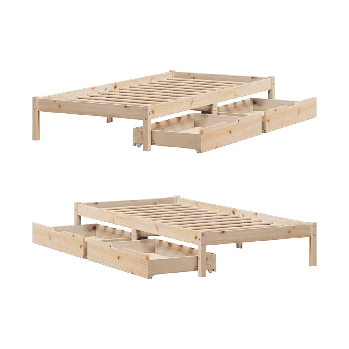 Consigue un sueño más reparador con esta estructura de cama. Es un aporte acogedor para cualquier dormitorio. Estructura estable y duradera: La madera de pino maciza es conocida por su resistencia y durabilidad. Sus vetas rectas y sus característicos nudos contribuyen a su encanto rústico.Somier de láminas para un soporte óptimo: La estructura de cama está equipada con un somier de láminas para el apoyo y la transpirabilidad del colchón.Aprovecha al máximo el espacio: Esta estructura de cama cuenta con dos cajones debajo, que proporcionan almacenamiento para artículos como ropa de cama extra, ropa de temporada y juguetes.Maniobrabilidad sin esfuerzo: Este cajón de almacenamiento bajo la cama cuenta con cuatro ruedas, que proporcionan una maniobrabilidad suave y sin esfuerzo para deslizarse dentro y fuera de debajo de tu cama. Información útil:El colchón no está incluido con la cama. Disponemos de una variada selección de colchones. Puedes echar un vistazo a nuestra tienda para buscar el colchón correspondiente.