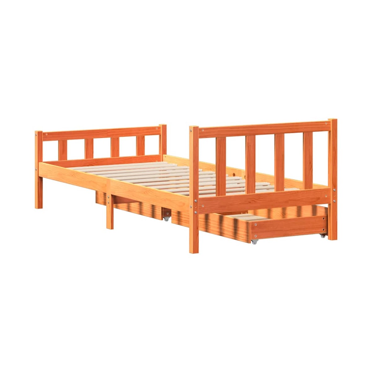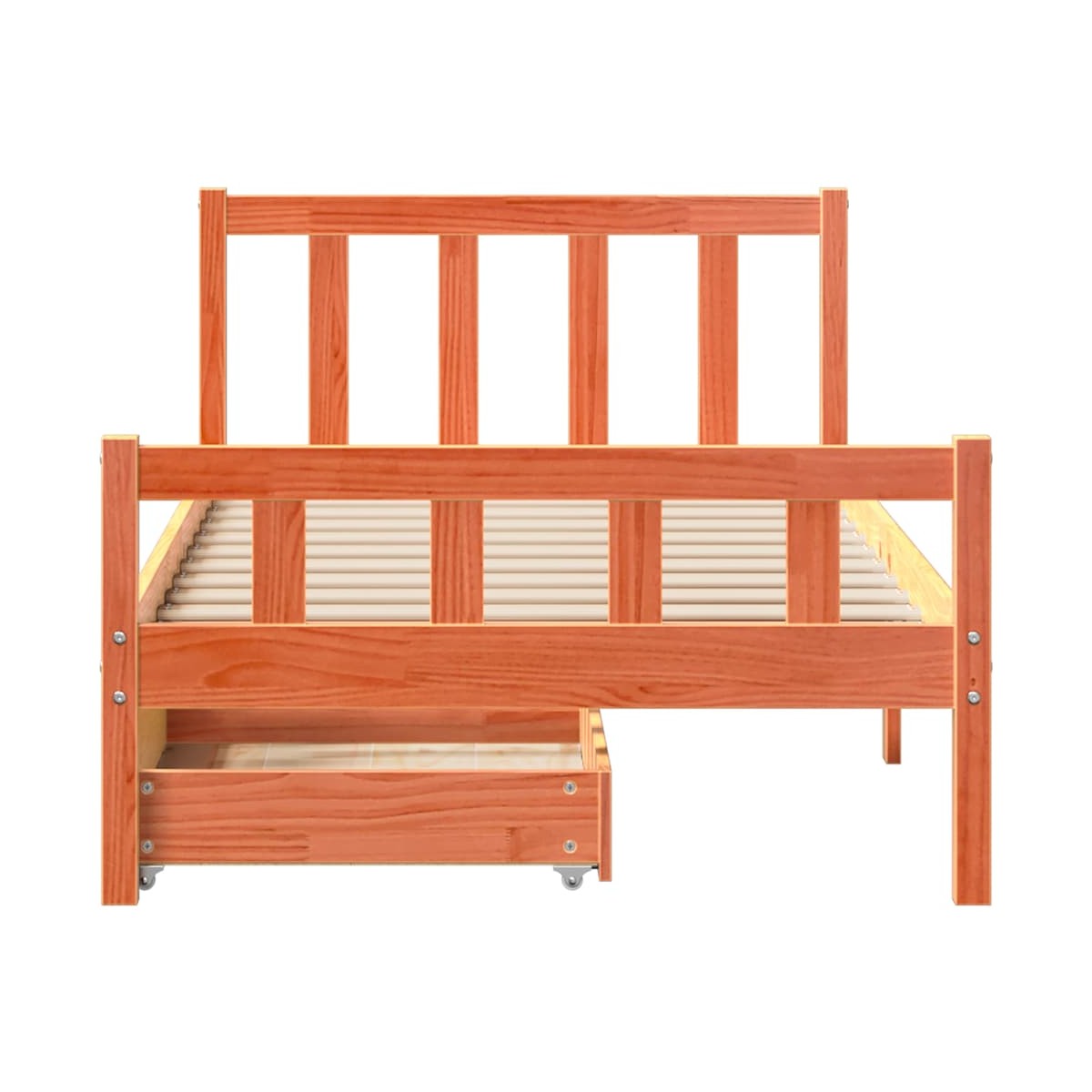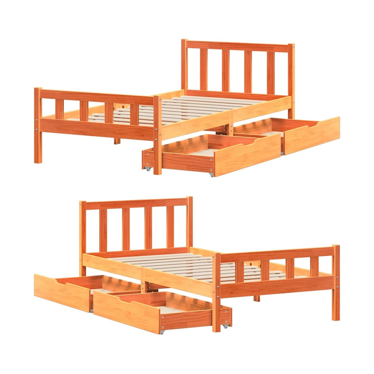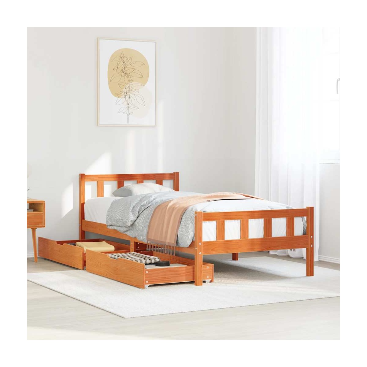 Consigue un sueño más reparador con esta estructura de cama. Es un aporte acogedor para cualquier dormitorio. Estructura estable y duradera: La madera de pino maciza es conocida por su resistencia y durabilidad. Sus vetas rectas y sus característicos nudos contribuyen a su encanto rústico.Somier de láminas para un soporte óptimo: La estructura de cama está equipada con un somier de láminas para el apoyo y la transpirabilidad del colchón.Aprovecha al máximo el espacio: Esta estructura de cama cuenta con dos cajones debajo, que proporcionan almacenamiento para artículos como ropa de cama extra, ropa de temporada y juguetes.Maniobrabilidad sin esfuerzo: Este cajón de almacenamiento bajo la cama cuenta con cuatro ruedas, que proporcionan una maniobrabilidad suave y sin esfuerzo para deslizarse dentro y fuera de debajo de tu cama. Información útil:El colchón no está incluido con la cama. Disponemos de una variada selección de colchones. Puedes echar un vistazo a nuestra tienda para buscar el colchón correspondiente.