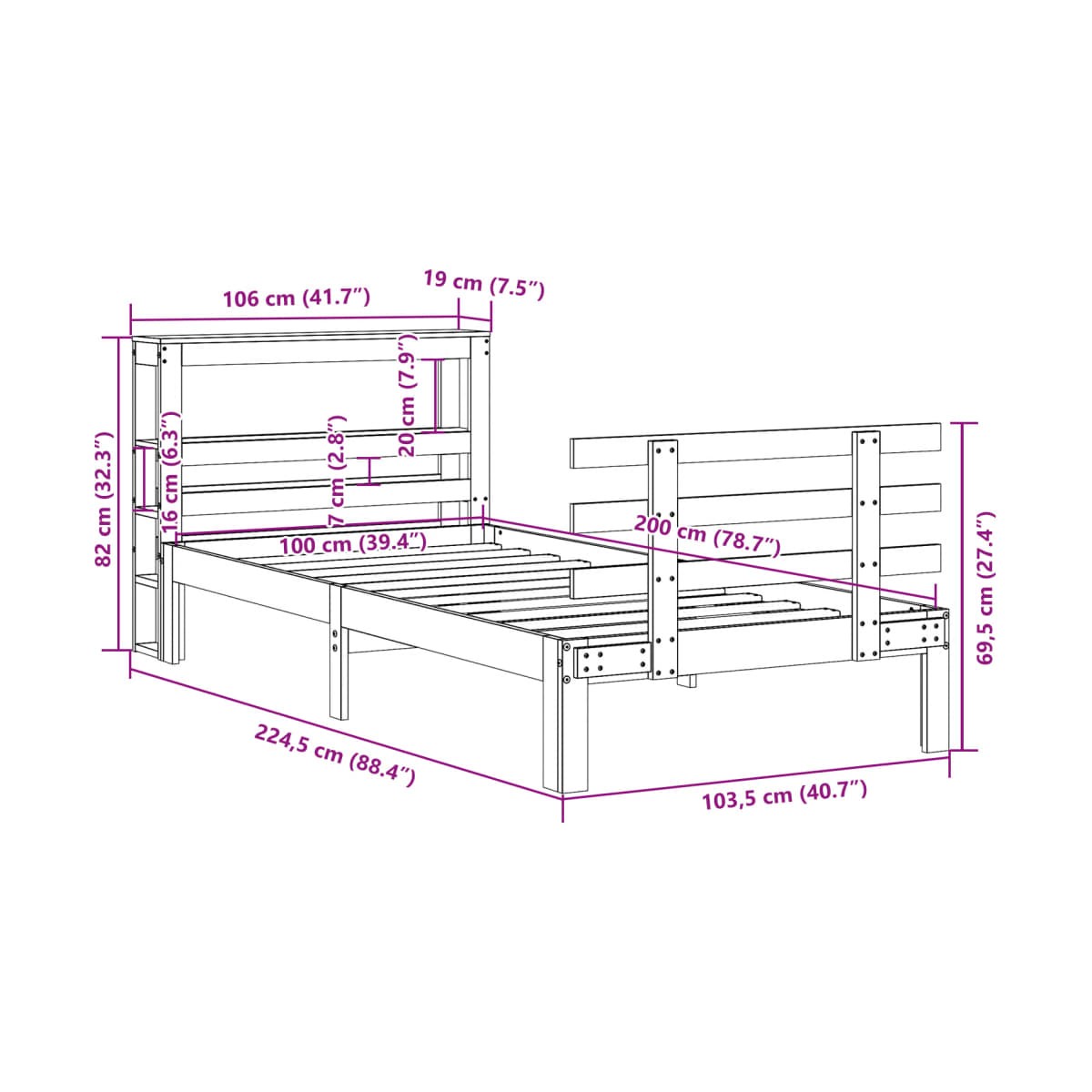 - Dimensiones del cabecero: 106 x 19 x 82 cm (largo x ancho x alto)