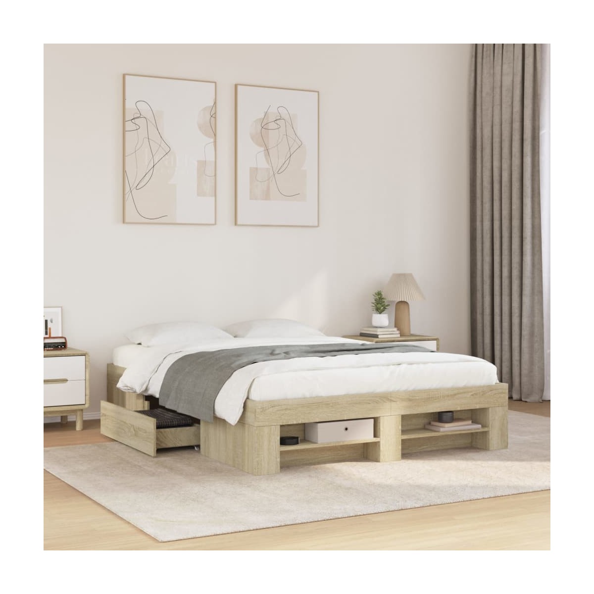 Consigue un sueño más reparador con esta estructura de cama. Es un aporte acogedor para cualquier dormitorio. Material duradero: La estructura de la cama está hecha de madera de ingeniería. La madera de ingeniería tiene una calidad excepcional, con una superficie lisa y también con fuerza, estabilidad y resistencia a la humedad.Somier de láminas para un soporte óptimo: La estructura de cama está equipada con un somier de láminas para el apoyo y la transpirabilidad del colchón.Función de almacenamiento: Este somier ofrece cajones y compartimentos abiertos para mantener tus revistas, libros, juguetes y otros objetos pequeños bien organizados. Información útil:El colchón no está incluido con la cama. Disponemos de una variada selección de colchones. Puedes echar un vistazo a nuestra tienda para buscar el colchón correspondiente.