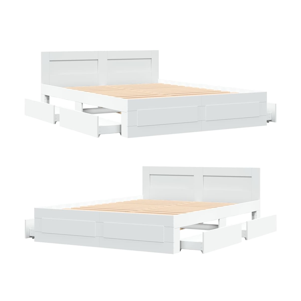 Consigue un sueño más reparador con esta estructura de cama. Es un aporte acogedor para cualquier dormitorio. Material duradero: La estructura de la cama está hecha de madera de ingeniería. La madera de ingeniería tiene una calidad excepcional, con una superficie lisa y también con fuerza, estabilidad y resistencia a la humedad.Somier de láminas para un soporte óptimo: La estructura de cama está equipada con un somier de láminas para el apoyo y la transpirabilidad del colchón.Función de almacenamiento: Este somier ofrece cajones para mantener tus revistas, libros, juguetes y otros objetos pequeños bien organizados.Excelente apoyo: El cabecero de la cama te ofrece un excelente soporte para la espalda mientras estás sentado en la cama leyendo o mirando televisión. Información útil:El colchón no está incluido con la cama. Disponemos de una variada selección de colchones. Puedes echar un vistazo a nuestra tienda para buscar el colchón correspondiente.