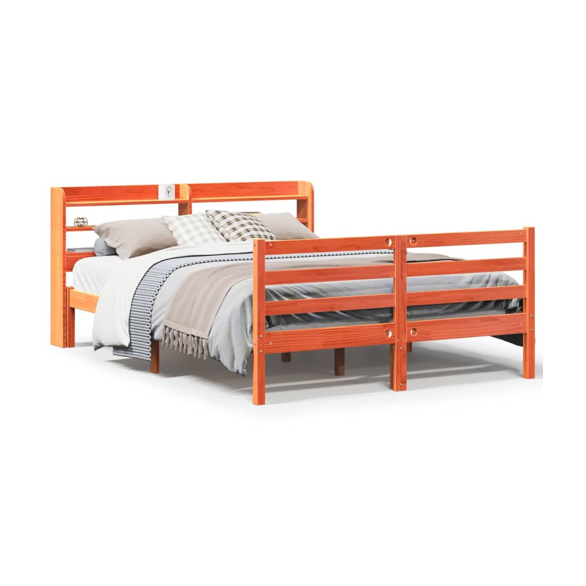 Consigue un sueño más reparador con esta estructura de cama. Es un aporte acogedor para cualquier dormitorio. Estructura estable y duradera: La madera de pino maciza es conocida por su resistencia y durabilidad. Sus vetas rectas y sus característicos nudos contribuyen a su encanto rústico.Somier de láminas para un soporte óptimo: La estructura de cama está equipada con un somier de láminas para el apoyo y la transpirabilidad del colchón.Cabecero versátil: Esta estructura de cama viene con un cabecero que proporciona un excelente soporte para la espalda cuando te sientas en la cama para leer o ver la televisión, a la vez que sirve como elemento decorativo.Amplio espacio de almacenamiento: Este elegante cabecero cuenta con tres prácticos estantes, que ofrecen un amplio espacio de almacenamiento para mantener todos tus objetos esenciales nocturnos al alcance de la mano. Información útil:El colchón no está incluido con la cama. Disponemos de una variada selección de colchones. Puedes echar un vistazo a nuestra tienda para buscar el colchón correspondiente.