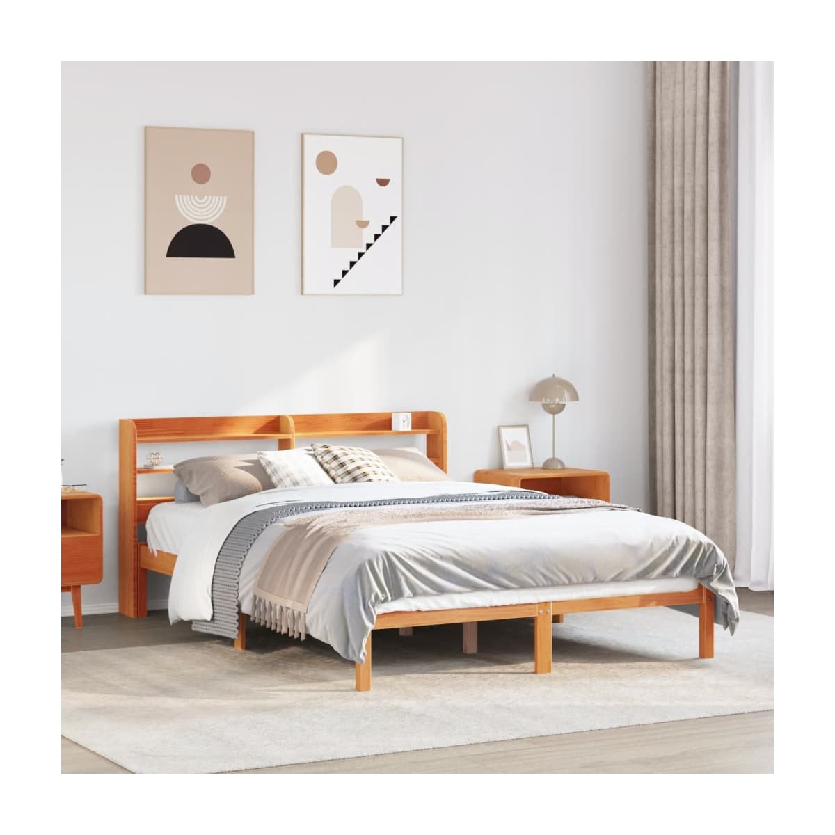 ¡Disfruta de una buena noche de sueño en esta estructura de cama de madera! Es un aporte práctico y decorativo para la casa. Madera de pino maciza: La madera de pino maciza es un bonito material natural. La madera de pino tiene vetas rectas, y los nudos dan al material su distintivo aspecto rústico.Estructura de cama resistente: La estructura de madera garantiza su solidez y estabilidad. Los listones de madera contrachapada proporcionan una buena distribución del peso, lo que garantiza que el colchón se mantenga en su sitio con cada giro y vuelta del cuerpo mientras duermes.Cabecero versátil: Esta estructura de cama viene con un cabecero que proporciona un excelente soporte para la espalda cuando te sientas en la cama para leer o ver la televisión, a la vez que sirve como elemento decorativo.Amplio espacio de almacenamiento: Este elegante cabecero cuenta con dos prácticos estantes, que ofrecen un amplio espacio de almacenamiento para tener todos tus artículos esenciales para la noche al alcance de la mano. Información útil:El colchón no está incluido con la cama. Disponemos de una variada selección de colchones. Puedes echar un vistazo a nuestra tienda para buscar el colchón correspondiente.