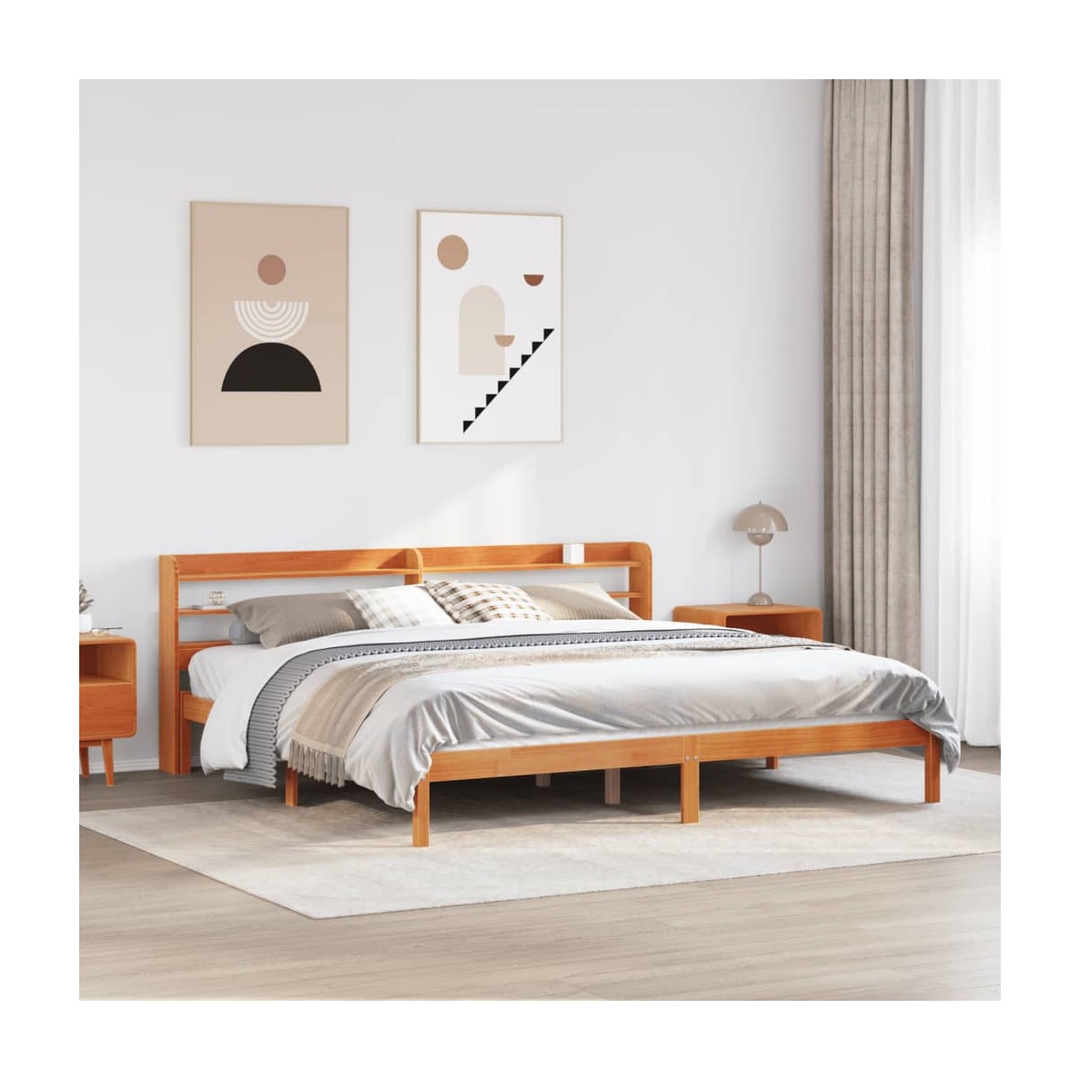 ¡Disfruta de una buena noche de sueño en esta estructura de cama de madera! Es un aporte práctico y decorativo para la casa. Madera de pino maciza: La madera de pino maciza es un bonito material natural. La madera de pino tiene vetas rectas, y los nudos dan al material su distintivo aspecto rústico.Estructura de cama resistente: La estructura de madera garantiza su solidez y estabilidad. Los listones de madera contrachapada proporcionan una buena distribución del peso, lo que garantiza que el colchón se mantenga en su sitio con cada giro y vuelta del cuerpo mientras duermes.Cabecero versátil: Esta estructura de cama viene con un cabecero que proporciona un excelente soporte para la espalda cuando te sientas en la cama para leer o ver la televisión, a la vez que sirve como elemento decorativo.Amplio espacio de almacenamiento: Este elegante cabecero cuenta con dos prácticos estantes, que ofrecen un amplio espacio de almacenamiento para tener todos tus artículos esenciales para la noche al alcance de la mano. Información útil:El colchón no está incluido con la cama. Disponemos de una variada selección de colchones. Puedes echar un vistazo a nuestra tienda para buscar el colchón correspondiente.