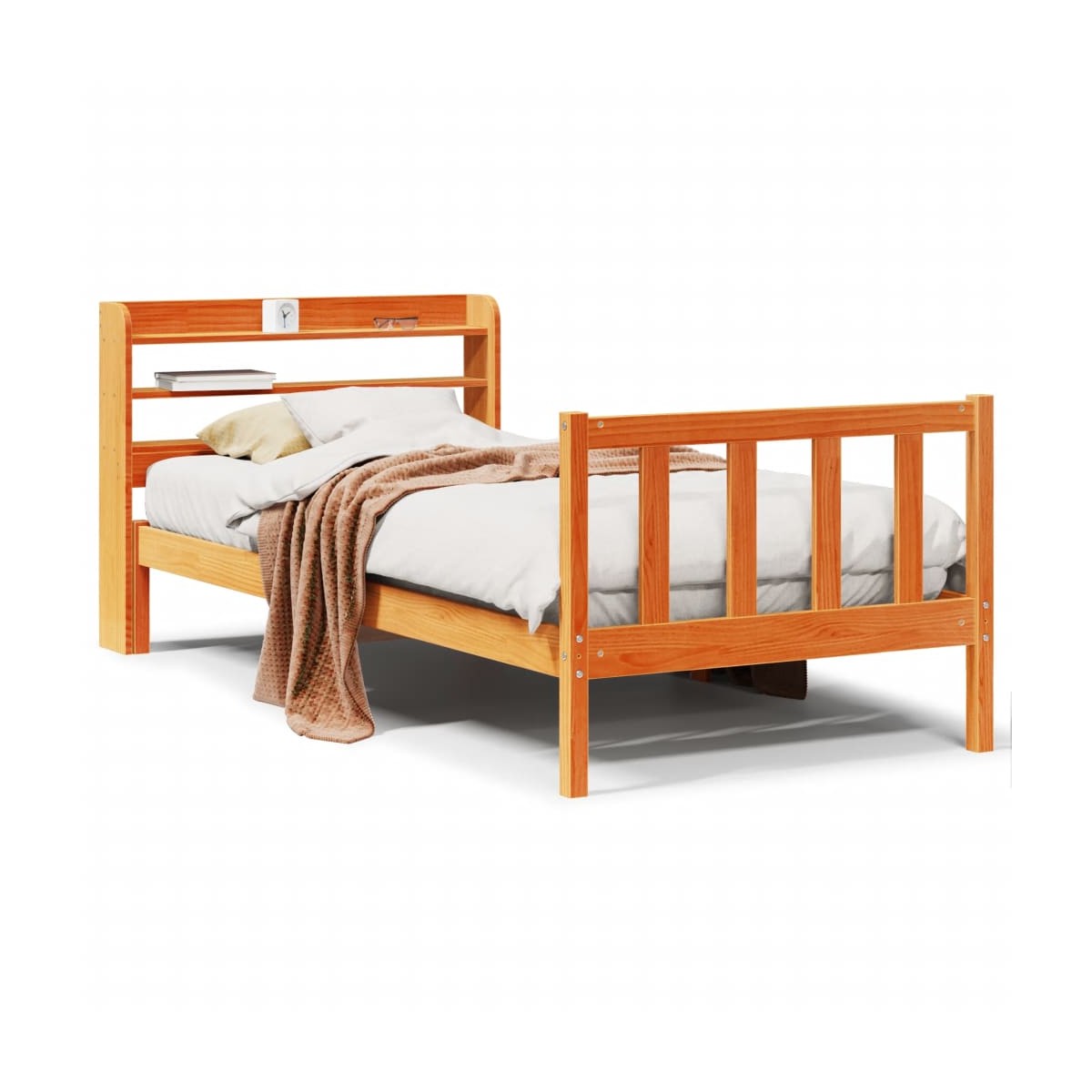 ¡Disfruta de una buena noche de sueño en esta estructura de cama de madera! Es un aporte práctico y decorativo para la casa. Madera de pino maciza: La madera de pino maciza es un bonito material natural. La madera de pino tiene vetas rectas, y los nudos dan al material su distintivo aspecto rústico.Estructura de cama resistente: La estructura de madera garantiza su solidez y estabilidad. Los listones de madera contrachapada proporcionan una buena distribución del peso, lo que garantiza que el colchón se mantenga en su sitio con cada giro y vuelta del cuerpo mientras duermes.Cabecero y estribo de cama útiles: El cabecero y el estribo de la cama de madera mantienen el colchón en su lugar. Además, la cabecera te brinda un excelente soporte para la espalda mientras estás sentado leyendo o mirando la televisión.Amplio espacio de almacenamiento: Este elegante cabecero cuenta con dos prácticos estantes, que ofrecen un amplio espacio de almacenamiento para tener todos tus artículos esenciales para la noche al alcance de la mano. Información útil:El colchón no está incluido con la cama. Disponemos de una variada selección de colchones. Puedes echar un vistazo a nuestra tienda para buscar el colchón correspondiente.