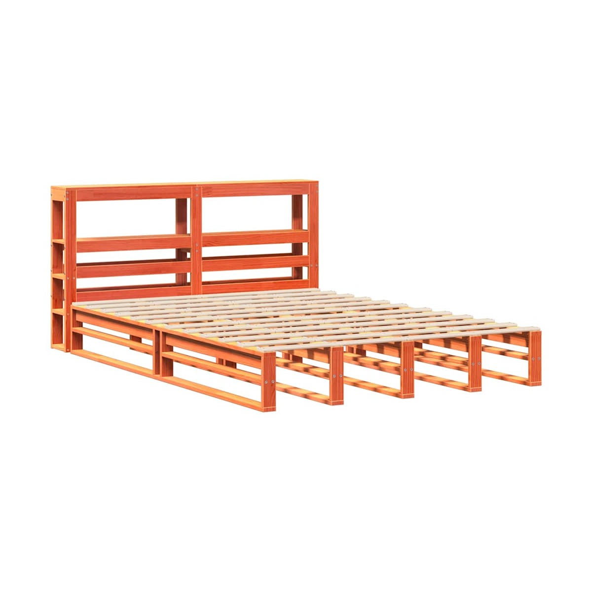 ¡Disfruta de una buena noche de sueño en esta estructura de cama de madera! Es un aporte práctico y decorativo para la casa. Estructura estable y duradera: La madera de pino maciza es conocida por su resistencia y durabilidad. Sus vetas rectas y sus característicos nudos contribuyen a su encanto rústico.Amplio espacio de almacenamiento: Este elegante cabecero cuenta con prácticos estantes, que ofrecen un amplio espacio de almacenamiento para mantener todos tus objetos esenciales nocturnos al alcance de la mano.Cabecero versátil: Esta estructura de cama de matrimonio viene con un cabecero que proporciona un excelente soporte para la espalda cuando te sientas en la cama para leer o ver la televisión, a la vez que sirve como elemento decorativo.Somier de láminas para un soporte óptimo: El base de cama está equipado con un somier de láminas para el apoyo y la transpirabilidad del colchón. Información útil:El colchón no está incluido con la cama. Disponemos de una variada selección de colchones. Puedes echar un vistazo a nuestra tienda para buscar el colchón correspondiente.