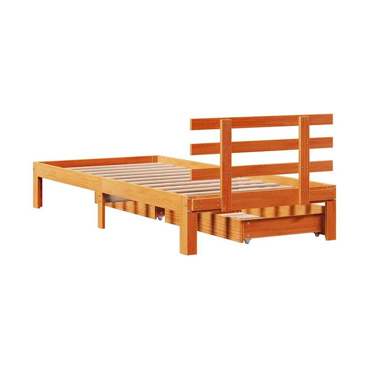 Consigue un sueño más reparador con esta estructura de cama. Es un aporte acogedor para cualquier dormitorio. Estructura estable y duradera: La madera de pino maciza es conocida por su resistencia y durabilidad. Sus vetas rectas y sus característicos nudos contribuyen a su encanto rústico.Somier de láminas para un soporte óptimo: La estructura de cama está equipada con un somier de láminas para el apoyo y la transpirabilidad del colchón.Espacio de almacenamiento extra: Esta base de cama cuenta con dos cajones debajo, lo que proporciona almacenamiento para artículos como ropa de cama, ropa de temporada y juguetes.Maniobrabilidad sin esfuerzo: Este cajón de almacenamiento bajo la cama cuenta con cuatro ruedas, que proporcionan una maniobrabilidad suave y sin esfuerzo para deslizarse dentro y fuera de debajo de tu cama. Información útil:El colchón no está incluido con la cama. Disponemos de una variada selección de colchones. Puedes echar un vistazo a nuestra tienda para buscar el colchón correspondiente.