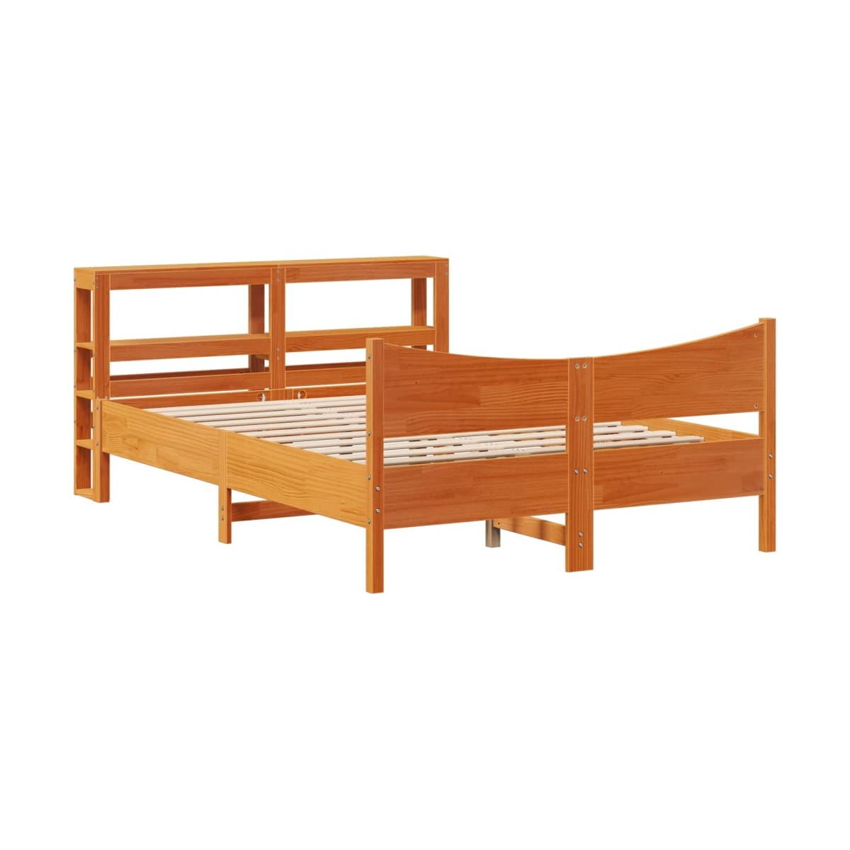 Consigue un sueño más reparador con esta estructura de cama. Es un aporte acogedor para cualquier dormitorio. Estructura estable y duradera: La madera de pino maciza es conocida por su resistencia y durabilidad. Sus vetas rectas y sus característicos nudos contribuyen a su encanto rústico.Somier de láminas para un soporte óptimo: La estructura de cama está equipada con un somier de láminas para el apoyo y la transpirabilidad del colchón.Amplio espacio de almacenamiento: Este elegante cabecero cuenta con dos prácticos estantes, que ofrecen un amplio espacio de almacenamiento para tener todos tus artículos esenciales para la noche al alcance de la mano.Cabecero independiente: El cabecero independiente ofrece una solución sin complicaciones para colocarlo y reposicionarlo sin esfuerzo y sin necesidad de instalarlo en la pared. Información útil:El colchón no está incluido con la cama. Disponemos de una variada selección de colchones. Puedes echar un vistazo a nuestra tienda para buscar el colchón correspondiente.