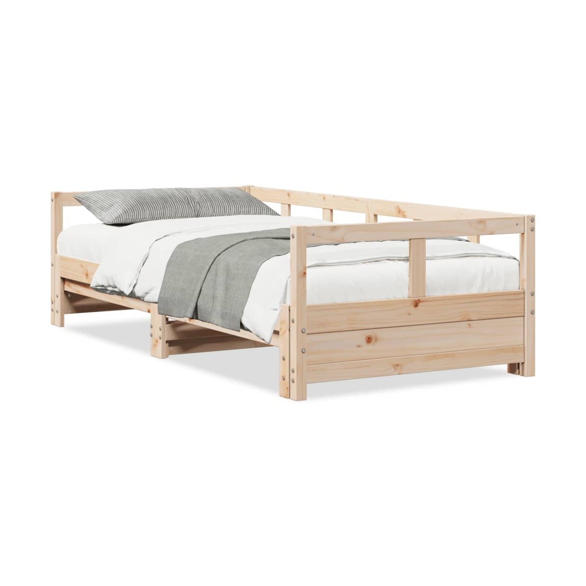 Este sofá cama 2 en 1 con nidos, que sirve como sofá y cama, es un complemento práctico y llamativo para tu salón o dormitorio.Estructura estable y duradera: La madera de pino maciza es conocida por su resistencia y durabilidad. Sus vetas rectas y sus característicos nudos contribuyen a su encanto rústico.Sofá cama versátil: El sofá cama funciona como sofá durante el día y se convierte fácilmente en una cama doble por la noche sacando la cama nido, lo que proporciona una solución práctica para recibir invitados y maximizar el espacio.Somier de láminas para un soporte óptimo: La estructura de cama está equipada con un somier de láminas para el apoyo y la transpirabilidad del colchón.Patas estables y duraderas: Esta cama está sostenida por patas resistentes, lo que garantiza estabilidad, seguridad y firmeza.Información útil:Ten en cuenta que la entrega incluye únicamente una estructura de cama. El colchón no está incluido. Puedes echar un vistazo a nuestra tienda para buscar el correspondiente colchón.