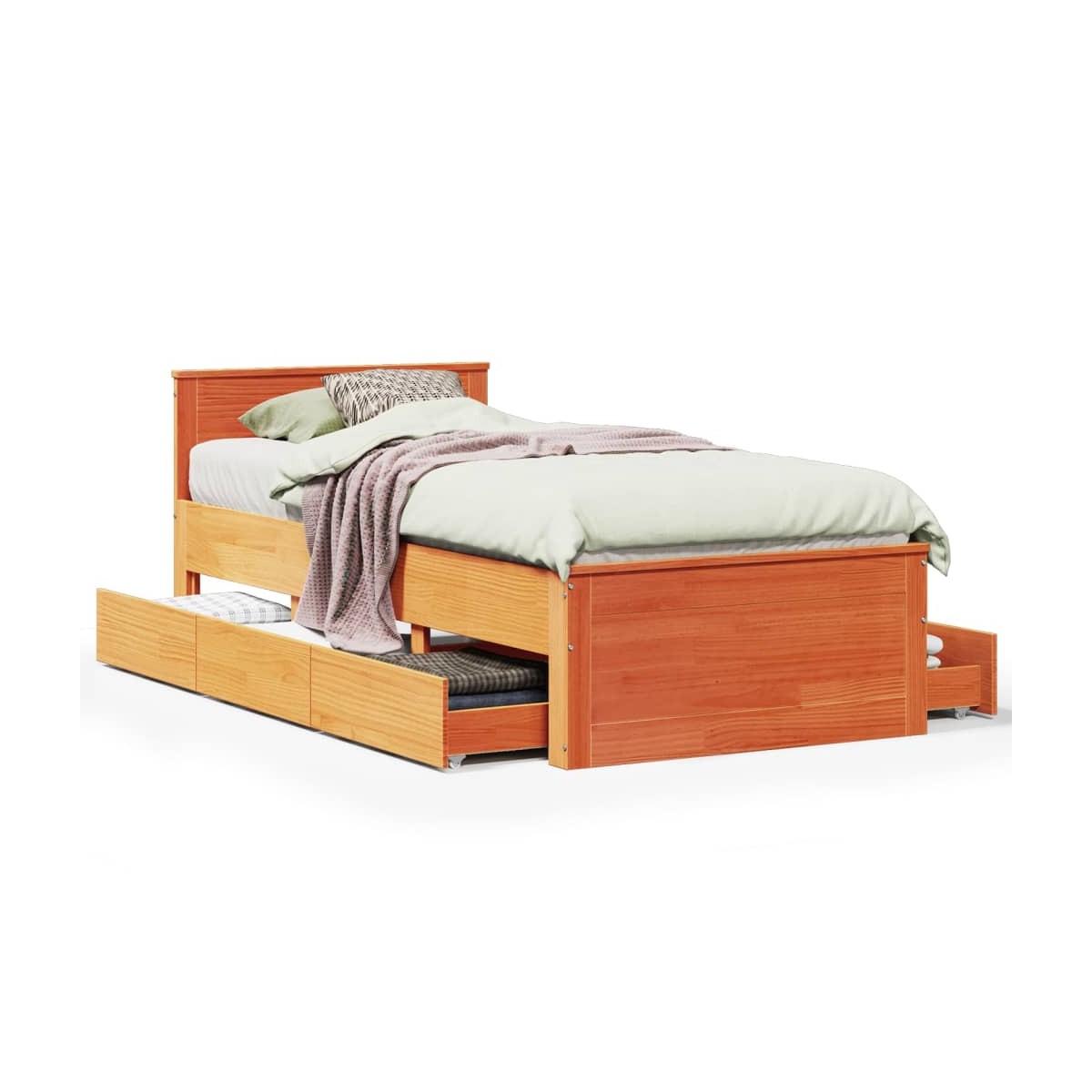 Consigue un sueño más reparador con esta estructura de cama. Es un aporte acogedor para cualquier dormitorio. Estructura estable y duradera: La madera de pino maciza es conocida por su resistencia y durabilidad. Sus vetas rectas y sus característicos nudos contribuyen a su encanto rústico.Somier de láminas para un soporte óptimo: La estructura de cama está equipada con un somier de láminas para el apoyo y la transpirabilidad del colchón.Patas estables y duraderas: Esta cama está sostenida por patas resistentes, lo que garantiza estabilidad, seguridad y firmeza.Cabecero funcional: El cabecero de la cama de madera puede mantener el colchón en su sitio. Además, el cabecero te brinda un excelente soporte para la espalda mientras estás sentado leyendo o mirando la televisión.Función de almacenamiento: Este somier ofrece cajones para mantener tus revistas, libros, juguetes y otros objetos pequeños bien organizados. Información útil:El colchón no está incluido con la cama. Disponemos de una variada selección de colchones. Puedes echar un vistazo a nuestra tienda para buscar el colchón correspondiente.