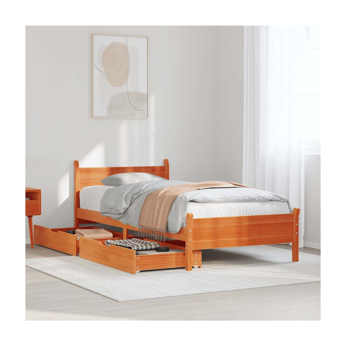 Consigue un sueño más reparador con esta estructura de cama. Es un aporte acogedor para cualquier dormitorio. Estructura estable y duradera: La madera de pino maciza es conocida por su resistencia y durabilidad. Sus vetas rectas y sus característicos nudos contribuyen a su encanto rústico.Somier de láminas para un soporte óptimo: El base de cama está equipado con un somier de láminas para el apoyo y la transpirabilidad del colchón.Maniobrabilidad sin esfuerzo: Este cajón de almacenamiento bajo la cama cuenta con cuatro ruedas, que proporcionan una maniobrabilidad suave y sin esfuerzo para deslizarse dentro y fuera de debajo de tu cama.Patas estables y duraderas: Este somier está sostenido por patas resistentes, lo que garantiza estabilidad, seguridad y firmeza.Cabecero versátil: Esta cama de paneles viene con un cabecero que proporciona un excelente soporte para la espalda cuando te sientas en la cama para leer o ver la televisión, a la vez que sirve como elemento decorativo. Información útil:El colchón no está incluido con la cama. Disponemos de una variada selección de colchones. Puedes echar un vistazo a nuestra tienda para buscar el colchón correspondiente.