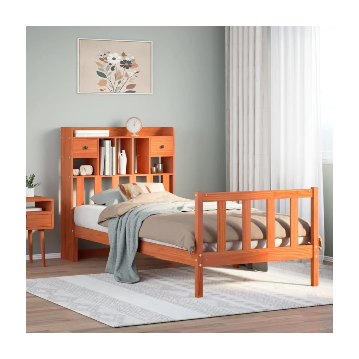 ¡Consigue una mejor noche de sueño reparador con esta cama con estantería! Es un aporte acogedor para cualquier dormitorio. Estructura estable y duradera: La madera de pino maciza es conocida por su resistencia y durabilidad. Sus vetas rectas y sus característicos nudos contribuyen a su encanto rústico.Somier de láminas para un soporte óptimo: La estructura de cama está equipada con un somier de láminas para el apoyo y la transpirabilidad del colchón.Amplio espacio de almacenamiento: El cabecero de estantería ofrece un amplio espacio de almacenamiento para mantener libros, artículos decorativos o pertenencias personales al alcance de la mano, lo que reduce el desorden en el dormitorio.Práctico pie de cama: El pie de cama no solo contribuye a la estabilidad general del marco de la cama, proporcionando un entorno seguro para dormir, sino que también asegura su colchón en su lugar y evita que las mantas, sábanas y otra ropa de cama se caigan del extremo de la cama, manteniendo una apariencia ordenada.Ahorro de espacio: Este cabecero es una opción de ahorro de espacio que puede sustituir la necesidad de una mesilla de noche, ayudando a maximizar el espacio de tu dormitorio, y haciéndolo ideal para espacios pequeños o limitados. Información útil:El colchón no está incluido con la cama. Disponemos de una variada selección de colchones. Puedes echar un vistazo a nuestra tienda para buscar el colchón correspondiente.