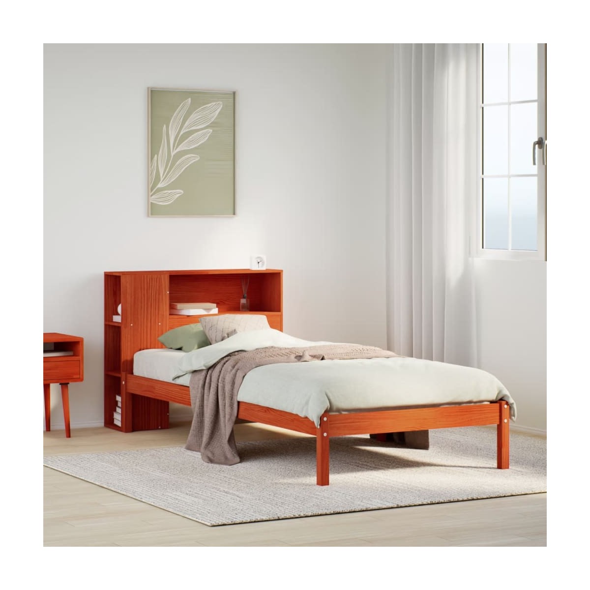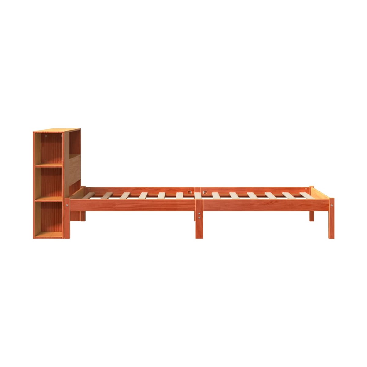 ¡Consigue una mejor noche de sueño reparador con esta cama con estantería! Es un aporte acogedor para cualquier dormitorio. Estructura estable y duradera: La madera de pino maciza es conocida por su resistencia y durabilidad. Sus vetas rectas y sus característicos nudos contribuyen a su encanto rústico.Somier de láminas para un soporte óptimo: La estructura de cama está equipada con un somier de láminas para el apoyo y la transpirabilidad del colchón.Amplio espacio de almacenamiento: El cabecero de estantería ofrece un amplio espacio de almacenamiento para mantener libros, artículos decorativos o pertenencias personales al alcance de la mano, lo que reduce el desorden en el dormitorio.Ahorro de espacio: Este cabecero es una opción de ahorro de espacio que puede sustituir la necesidad de una mesilla de noche, ayudando a maximizar el espacio de tu dormitorio, y haciéndolo ideal para espacios pequeños o limitados. Información útil:El colchón no está incluido con la cama. Disponemos de una variada selección de colchones. Puedes echar un vistazo a nuestra tienda para buscar el colchón correspondiente.