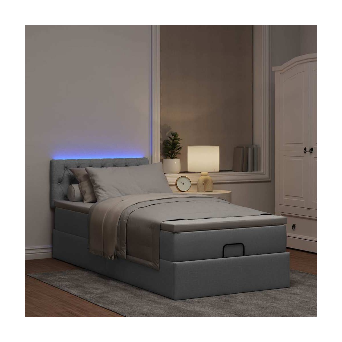 Esta cama otomana combina a la perfección la estética moderna con la funcionalidad práctica, ofreciéndole tanto una solución de almacenamiento como una experiencia de sueño cómoda. Material suave y duradero: La tela de poliéster ofrece una combinación de suavidad, transpirabilidad y durabilidad, lo que garantiza que experimentes la máxima comodidad.Colchón de muelles ensacados: El muelle ensacado individual incorporado es conocido por su altísima calidad, al tiempo que garantiza un alto nivel de durabilidad y adaptabilidad. Puede absorber eficazmente el ruido y los golpes causados por los lanzamientos y los giros.Luces LED para un ambiente agradable: Esta cama cuenta con luces LED que se pueden ajustar fácilmente para crear un espectáculo de luces personalizado. Puedes personalizar los modos, los colores y el brillo para mejorar el ambiente de tu espacio interior.Cubrecolchón cómodo: Este cubrecolchón mejora el soporte y la comodidad con su superficie suave y transpirable al tiempo que prolonga la vida útil de su colchón. Su funda extraíble permite un fácil lavado, lo que facilita el mantenimiento. Información útil:Por razones de higiene, el colchón no puede devolverse si se ha quitado o abierto el embalaje.El producto tiene un conector USB que necesita una fuente de alimentación USB certificada de 45 V (no incluida).Únicamente puedes cortar por la parte con el símbolo de las tijeras y únicamente la parte con el USB seguirá funcionando como antes.