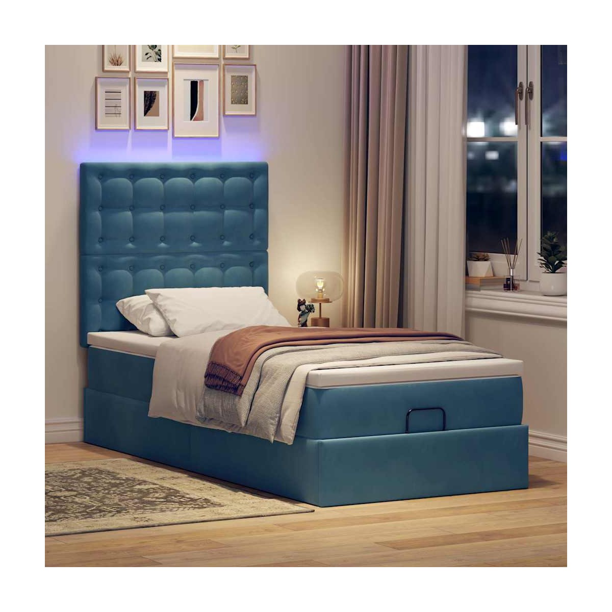 ¡Utilice esta estructura de cama otomana con colchones para disfrutar de una noche de sueño reparador! Le ofrece una solución de almacenamiento y una experiencia de sueño cómoda. Material suave y cómodo: La tela de terciopelo ofrece una superficie suave y lisa que proporciona una agradable sensación contra el tacto, aportándole calidez y el máximo confort.Colchón de muelles ensacados: Este colchón de muelles ensacados cuenta con muelles ensacados individuales que funcionan de forma independiente para proporcionar un apoyo personalizado reaccionando únicamente a la presión de cada zona. Este diseño evita que se enrolle y reduce la transferencia de movimiento en comparación con los colchones tradicionales de bobina abierta. Cada muelle ensacado sostiene el cuerpo individualmente.amplio espacio de almacenamiento debajo de la cama: gracias al mecanismo de elevación hidráulico, el marco de la cama ofrece un amplio espacio de almacenamiento debajo de la cama, maximizando el espacio sin ocupar área adicional en el piso.Cubrecolchón cómodo: Este cubrecolchón mejora el soporte y la comodidad con su superficie suave y transpirable al tiempo que prolonga la vida útil de su colchón. Su funda extraíble permite un fácil lavado, lo que facilita el mantenimiento.Luces LED para un ambiente agradable: Esta cama cuenta con luces LED que se pueden ajustar fácilmente para crear un espectáculo de luces personalizado. Puedes personalizar los modos, los colores y el brillo para mejorar el ambiente de tu espacio interior. Información útil:El producto tiene un conector USB que necesita una fuente de alimentación USB certificada de 5 V (no incluida).Por razones de higiene, el colchón no puede devolverse si se ha quitado o abierto el embalaje.Únicamente puedes cortar por la parte con el símbolo de las tijeras y únicamente la parte con el USB seguirá funcionando como antes.