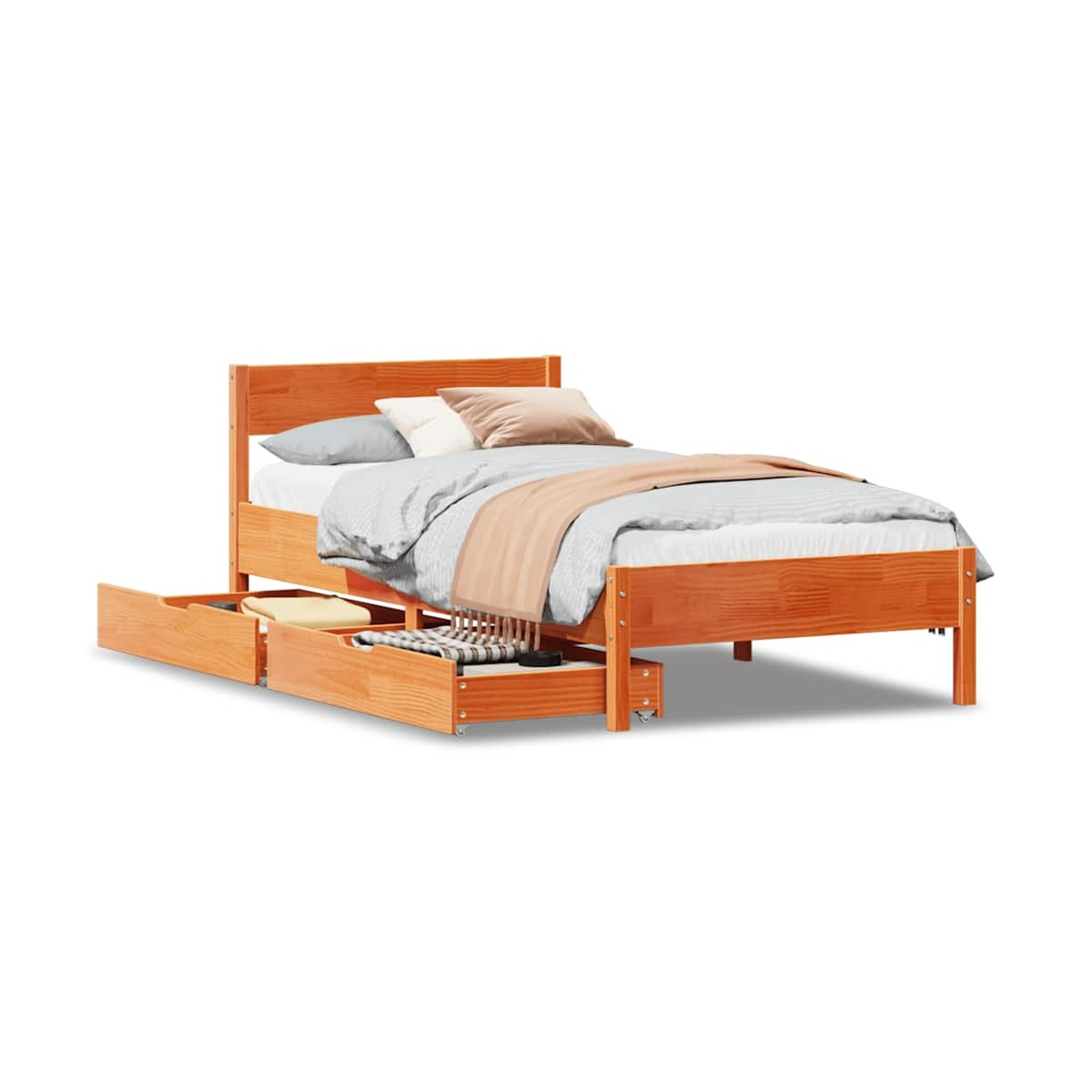 Consigue un sueño más reparador con esta estructura de cama. Es un aporte acogedor para cualquier dormitorio. Estructura estable y duradera: La madera de pino maciza es conocida por su resistencia y durabilidad. Sus vetas rectas y sus característicos nudos contribuyen a su encanto rústico.Somier de láminas para un soporte óptimo: La estructura de cama está equipada con un somier de láminas para el apoyo y la transpirabilidad del colchón.Cabecero versátil: Esta estructura de cama viene con un cabecero que proporciona un excelente soporte para la espalda cuando te sientas en la cama para leer o ver la televisión, a la vez que sirve como elemento decorativo.Aproveche al máximo el espacio: Este somier cuenta con dos cajones debajo, que proporcionan almacenamiento para artículos como ropa de cama extra, ropa de temporada y juguetes.Maniobrabilidad sin esfuerzo: Este cajón de almacenamiento bajo la cama cuenta con cuatro ruedas, que proporcionan una maniobrabilidad suave y sin esfuerzo para deslizarse dentro y fuera de debajo de tu cama. Información útil:El colchón no está incluido con la cama. Disponemos de una variada selección de colchones. Puedes echar un vistazo a nuestra tienda para buscar el colchón correspondiente.