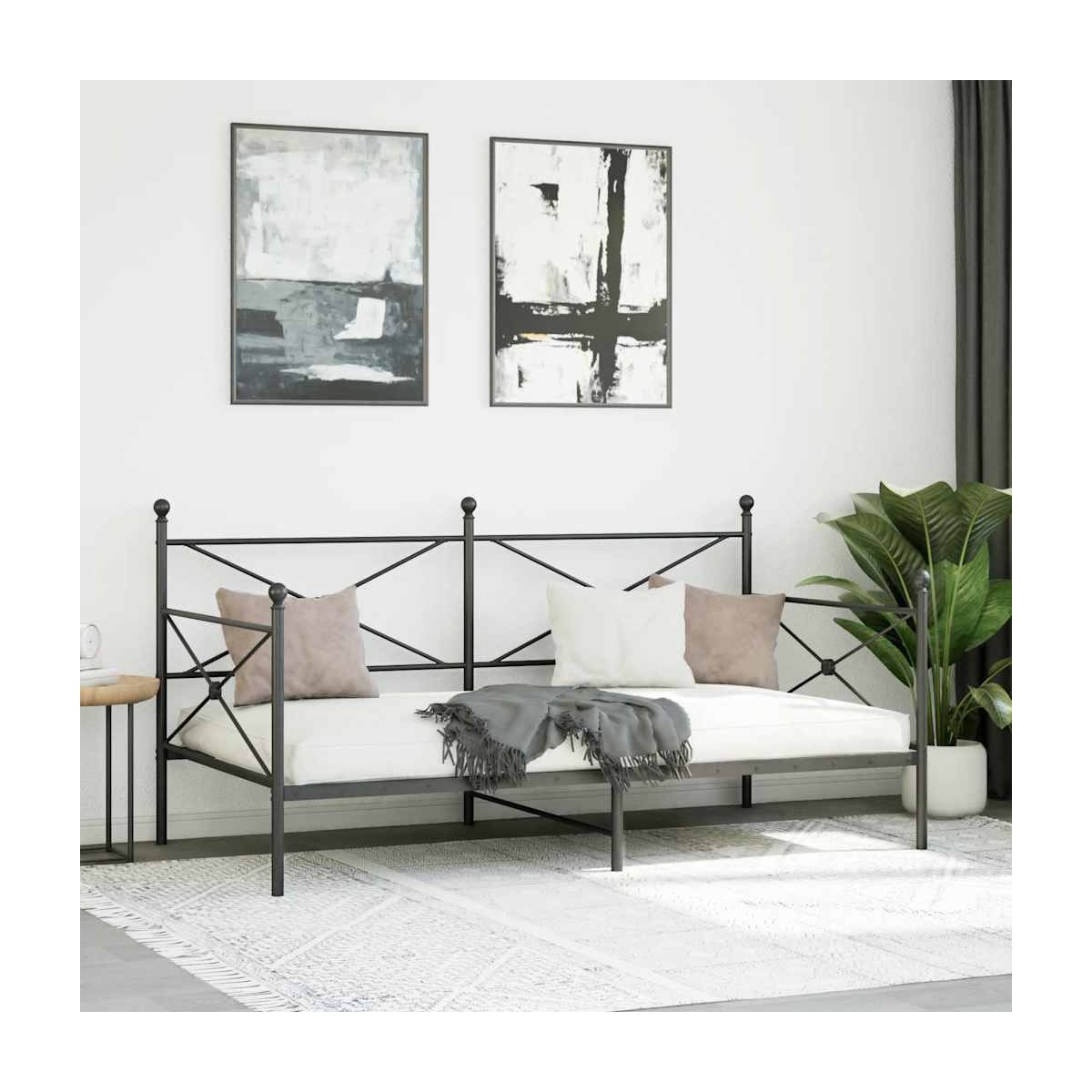 Este elegante diván ofrece un lugar acogedor para descansar y un práctico espacio de almacenamiento, lo que lo convierte en el complemento perfecto para cualquier dormitorio o sala de estar. Estructura estable y duradera: El acero es fuerte, estable y duradero, lo que lo convierte en la opción ideal para una amplia gama de aplicaciones, desde la fabricación de muebles hasta la construcción.Somier de láminas para un soporte óptimo: El sofá cama está equipado con un somier de láminas para proporcionar apoyo y transpirabilidad a su colchón.Espacio de almacenamiento adicional: para mayor comodidad, la cama de invitados tiene un espacio adicional debajo para mantener sus cajas de almacenamiento fuera de la vista.Patas estables y duraderas: este sofá cama está sostenido por patas resistentes que garantizan estabilidad, seguridad y firmeza. Información útil:El colchón no está incluido con la cama. Ofrecemos una variada selección de colchones. Puedes echar un vistazo a nuestra tienda para buscar el colchón correspondiente.
