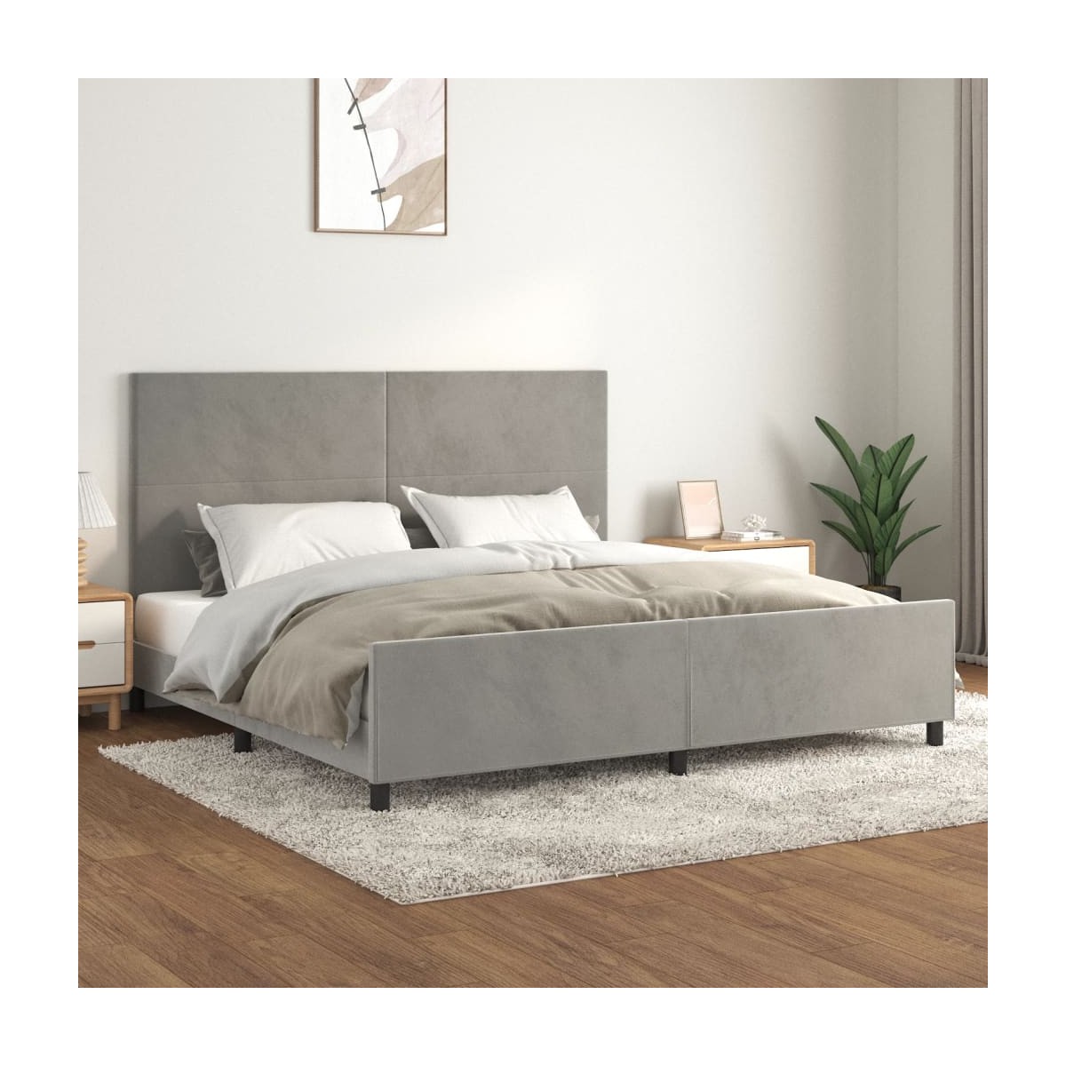 ¡Consigue un sueño más reparador con esta estructura de cama con cabecero! Es un aporte acogedor para cualquier dormitorio. Terciopelo suave: El terciopelo es una tela suave y lujosa, reconocida por su denso pelo de fibras cortadas de forma uniforme que tienen una suave pelusa. La tela de terciopelo posee un característico y suave tacto, lo que hace que sea cómoda al tacto.Altura regulable: El cabecero de la cama es ajustable en altura según tus preferencias.Patas de apoyo: La cama se apoya en patas robustas, que garantizan su estabilidad, seguridad y firmeza.Listones robustos: Los listones de madera contrachapada proporcionan una buena distribución del peso, lo que garantiza que el colchón se mantenga en tu sitio con cada giro y vuelta del cuerpo mientras duermes.Excelente apoyo: El cabecero de la cama te proporciona un excelente apoyo para la espalda mientras estás sentado en la cama para leer o ver la televisión. Nota:La entrega incluye solo una estructura de cama. El colchón no está incluido. Puedes echar un vistazo en nuestra tienda para buscar colchones a juego.Cada producto viene con un manual de montaje en la caja para facilitar el montaje.