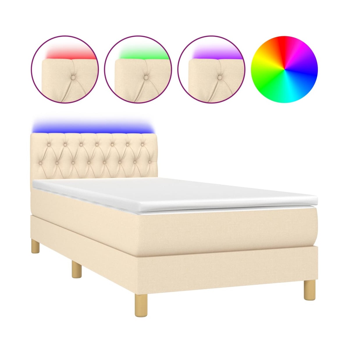 Utiliza esta cama box spring con colchón y LED para disfrutar de un sueño reparador. Es el centro de atención de tu dormitorio. Material de primera calidad: La tela posee un aspecto sencillo y limpio, y es transpirable y duradera.Cabecero práctico: El cabecero de la cama es ajustable en altura según tus preferencias. El cabecero de la cama te proporciona un excelente apoyo para la espalda mientras estás sentado en la cama para leer o ver la televisión.Tira de LED de colores: Alegra la oscuridad con luces LED de colores.Colchón de muelles ensacados: El muelle ensacado individual incorporado es conocido por su altísima calidad, al tiempo que garantiza un alto nivel de durabilidad y adaptabilidad. Puede absorber eficazmente el ruido y los golpes causados por los lanzamientos y los giros.Protector de colchón respetuoso con la piel: El protector de colchón tiene una funda de tejido resistente y respetuoso con la piel, que lo hace suave y confortable. Nota:Por razones de higiene, el colchón no puede devolverse si se ha quitado o abierto el embalaje.Cada producto viene con un manual de montaje en la caja para facilitar el montaje.Únicamente puedes cortar por la parte con el símbolo de las tijeras y únicamente la parte con el USB seguirá funcionando como antes.El producto tiene un conector USB, pero no se incluye la fuente de alimentación USB de 5 V certificada.