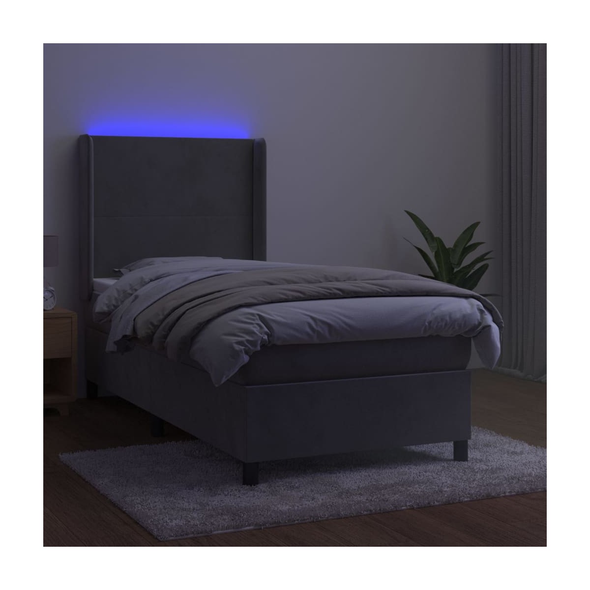 Utiliza esta cama tipo box spring con colchón y luces LED para disfrutar de un sueño reparador. Será el centro de atención del dormitorio. Terciopelo suave: El terciopelo es una tela suave y lujosa, reconocida por su denso pelo de fibras cortadas de forma uniforme que tienen una suave pelusa. La tela de terciopelo posee un característico y suave tacto, lo que hace que sea cómoda al tacto.Cabecero práctico: El cabecero de la cama es ajustable en altura según tus preferencias. El cabecero de la cama te proporciona un excelente apoyo para la espalda mientras estás sentado en la cama para leer o ver la televisión.Tira de LED de colores: Alegra la oscuridad con luces LED de colores.Colchón de muelles ensacados: El muelle ensacado individual incorporado es conocido por su altísima calidad, al tiempo que garantiza un alto nivel de durabilidad y adaptabilidad. Puede absorber eficazmente el ruido y los golpes causados por los lanzamientos y los giros.Protector de colchón respetuoso con la piel: El protector de colchón tiene una funda de tejido resistente y respetuoso con la piel, que lo hace suave y confortable. Nota:Por razones de higiene, el colchón no puede devolverse si se ha quitado o abierto el embalaje.Únicamente puedes cortar por la parte con el símbolo de las tijeras y únicamente la parte con el USB seguirá funcionando como antes.Cada producto viene con un manual de montaje en la caja para facilitar el montaje.El producto tiene un conector USB, pero no se incluye la fuente de alimentación USB de 5 V certificada.
