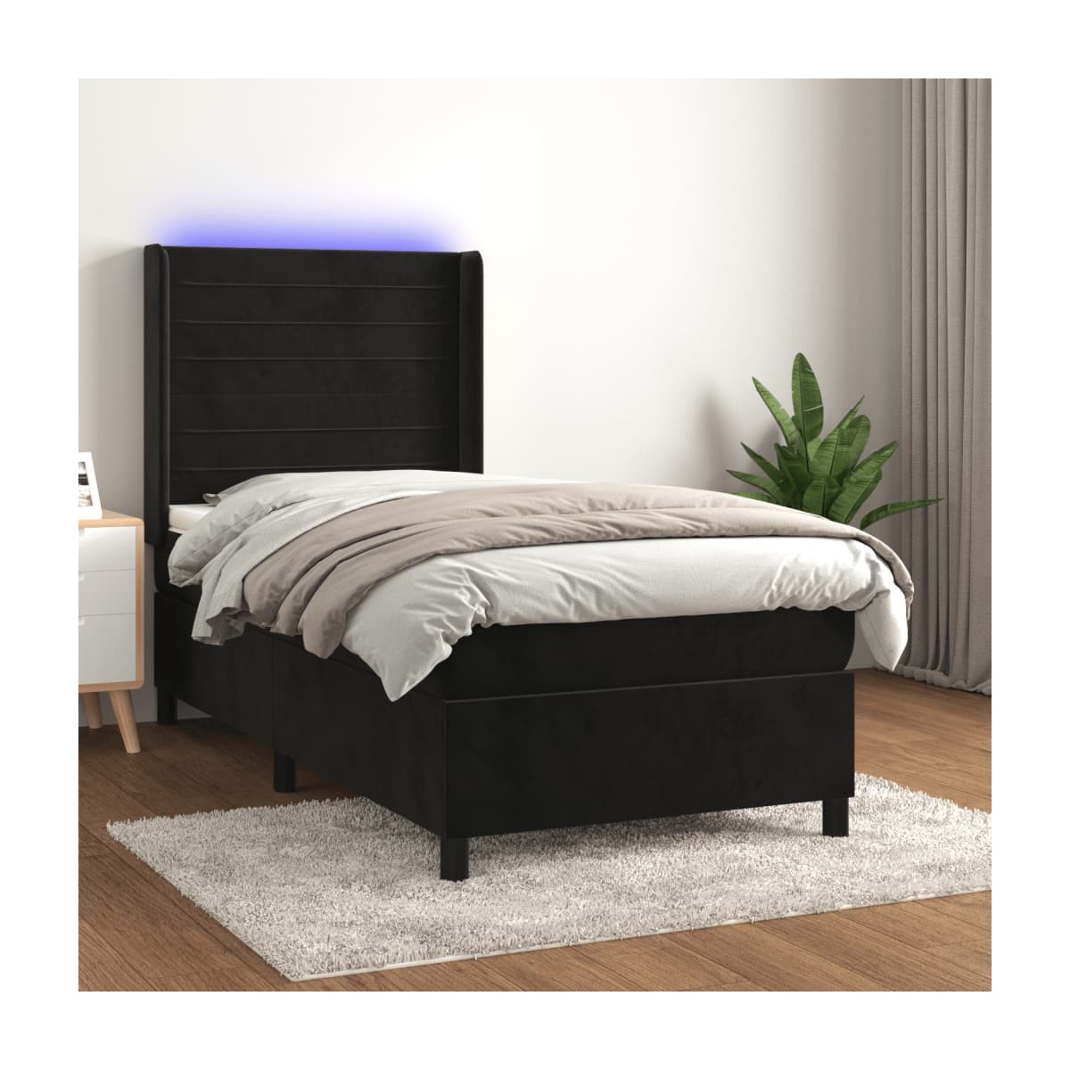 Utiliza esta cama tipo box spring con colchón y luces LED para disfrutar de un sueño reparador. Será el centro de atención del dormitorio. Terciopelo suave: El terciopelo es una tela suave y lujosa, reconocida por su denso pelo de fibras cortadas de forma uniforme que tienen una suave pelusa. La tela de terciopelo posee un característico y suave tacto, lo que hace que sea cómoda al tacto.Cabecero práctico: El cabecero de la cama es ajustable en altura según tus preferencias. El cabecero de la cama te proporciona un excelente apoyo para la espalda mientras estás sentado en la cama para leer o ver la televisión.Tira de LED de colores: Alegra la oscuridad con luces LED de colores.Colchón de muelles ensacados: El muelle ensacado individual incorporado es conocido por su altísima calidad, al tiempo que garantiza un alto nivel de durabilidad y adaptabilidad. Puede absorber eficazmente el ruido y los golpes causados por los lanzamientos y los giros.Protector de colchón respetuoso con la piel: El protector de colchón tiene una funda de tejido resistente y respetuoso con la piel, que lo hace suave y confortable. Nota:Por razones de higiene, el colchón no puede devolverse si se ha quitado o abierto el embalaje.Únicamente puedes cortar por la parte con el símbolo de las tijeras y únicamente la parte con el USB seguirá funcionando como antes.Cada producto viene con un manual de montaje en la caja para facilitar el montaje.El producto tiene un conector USB, pero no se incluye la fuente de alimentación USB de 5 V certificada.