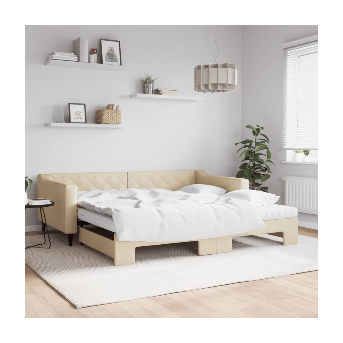 Este sofá cama 2 en 1 con cama nido, que sirve como sofá y cama, es un complemento práctico y llamativo para tu salón o dormitorio. Sofá cama versátil: El sofá cama funciona como sofá durante el día y se convierte fácilmente en una cama doble por la noche sacando la cama nido, lo que proporciona una solución práctica para recibir invitados y maximizar el espacio.Cómodo colchón de espuma: Esta cama se suministra con dos colchones de espuma para un máximo apoyo y una comodidad óptima.Tela duradera y construcción sólida: Este sofá cama tiene una estructura resistente hecha de madera y metal y está tapizado con una tela duradera y cómoda.Diseño moderno: ¡El sofá cama tiene un diseño moderno con líneas nítidas, un aspecto minimalista y añadirá un estilo moderno a la casa!