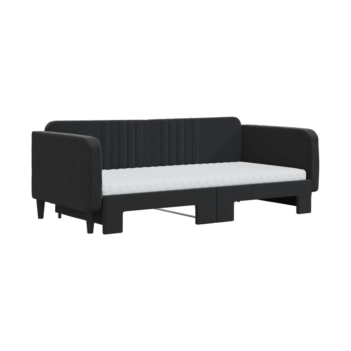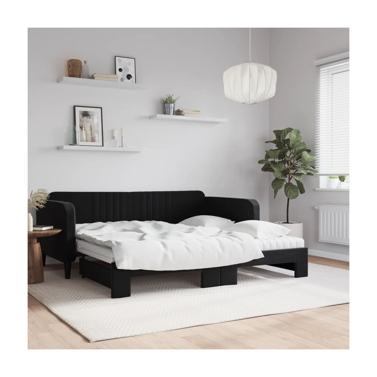 Este sofá cama 2 en 1 con cama nido, que sirve como sofá y cama, es un complemento práctico y llamativo para tu salón o dormitorio. Sofá cama versátil: El sofá cama funciona como sofá durante el día y se convierte fácilmente en una cama doble por la noche sacando la cama nido, lo que proporciona una solución práctica para recibir invitados y maximizar el espacio.Cómodo colchón de espuma: Esta cama se suministra con dos colchones de espuma para un máximo apoyo y una comodidad óptima.Terciopelo suave y construcción sólida: Este sofá cama tiene una estructura resistente hecha de madera y metal y está tapizado en terciopelo suave y cómodo.Diseño moderno: ¡El sofá cama tiene un diseño moderno con líneas nítidas, un aspecto minimalista, así como luz natural, y añadirá un estilo moderno a la casa!