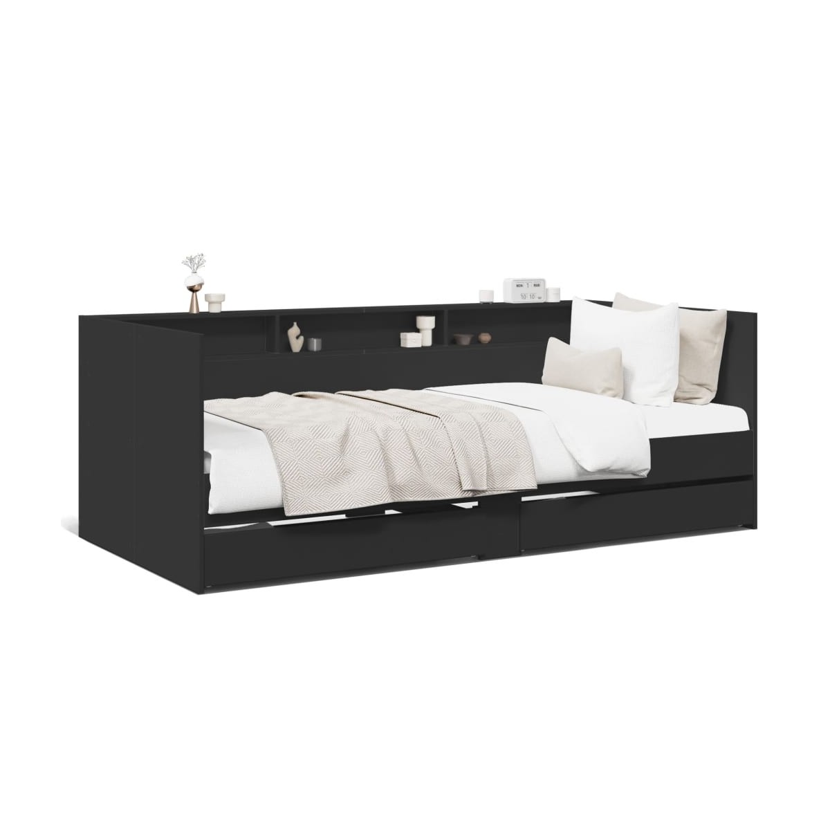 Este sofá cama 2 en 1 con cajones, que sirve como sofá y cama, es un complemento práctico y llamativo para tu salón o dormitorio. Sofá cama versátil: El sofá cama funciona como sofá durante el día y se convierte fácilmente en cama por la noche, lo que proporciona una solución práctica para recibir invitados y maximizar el espacio. Amplio espacio de almacenaje: Esta cama de invitados tiene 2 cajones con ruedas que brindan un amplio espacio para guardar ropa, calcetines, juguetes, cojines, etc.Sólida construcción: Este sofá cama tiene una estructura robusta de madera de ingeniería. La madera de ingeniería es de una calidad excepcional con una superficie lisa y cuenta con la fuerza, la estabilidad y la resistencia a la humedad. Información útil:Ten en cuenta que la entrega incluye únicamente una estructura de cama. El colchón no está incluido. Puedes echar un vistazo a nuestra tienda para buscar el correspondiente colchón.