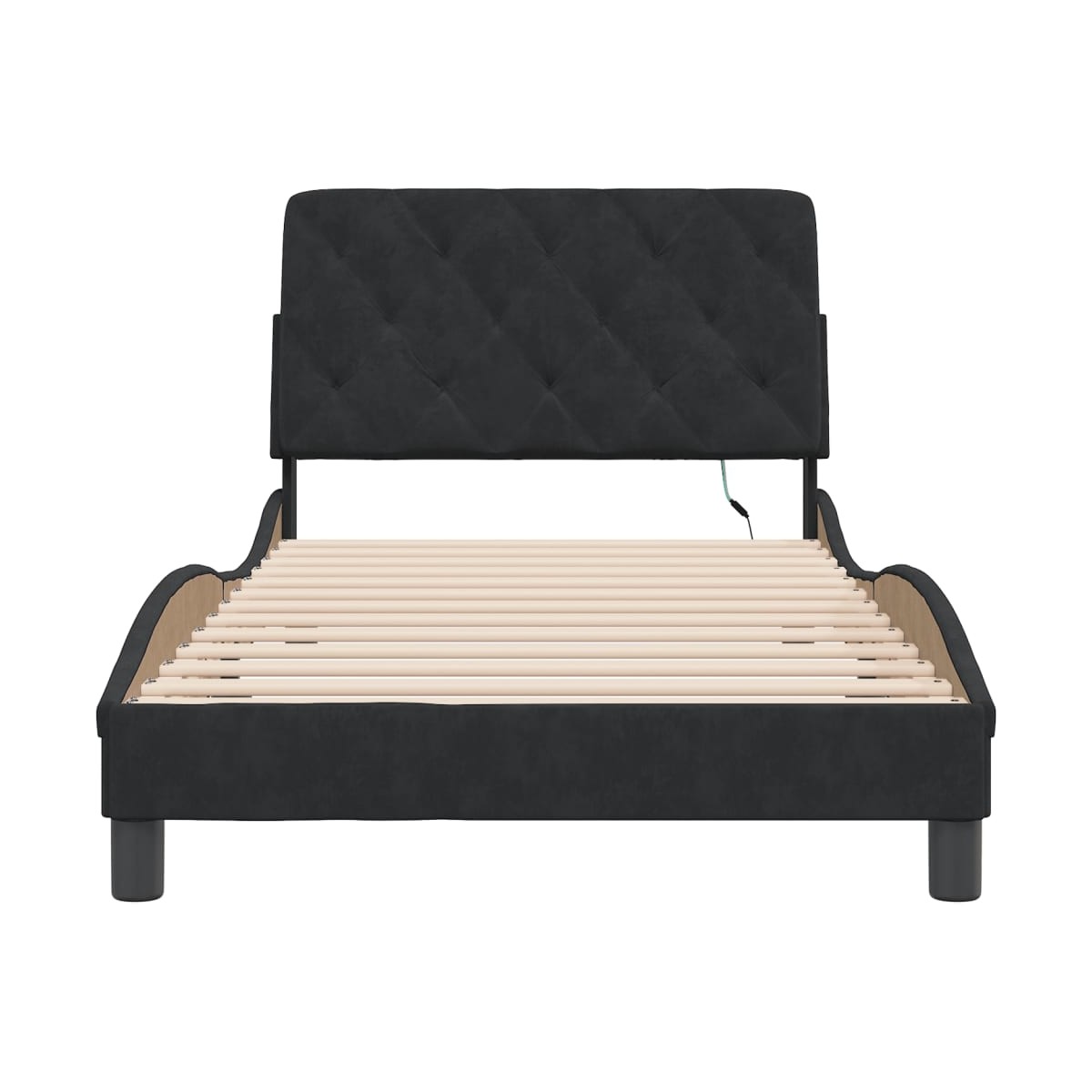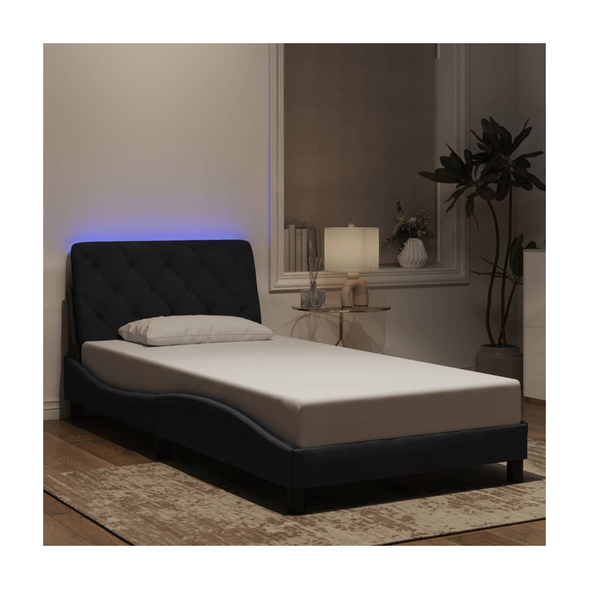 ¡Consigue tener un sueño reparador con esta estructura de cama con luces LED! Es un aporte acogedor para cualquier dormitorio. Terciopelo suave: El terciopelo es una tela suave y cálida, agradable al tacto. Listones robustos: Los listones de madera contrachapada proporcionan una buena distribución del peso, lo que garantiza que el colchón se mantenga en tu sitio con cada giro y vuelta del cuerpo mientras duermes. Excelente soporte: El cabecero acolchado está relleno de espuma para una comodidad ultrasuave y óptima, lo que te brinda un excelente soporte para la espalda mientras estás sentado en la cama para leer o ver la televisión. Tira de LED de colores: Alegra la oscuridad con luces LED de colores. Los cierres de gancho y bucle de la parte posterior del cojín del cabecero se pueden utilizar para fijar las luces LED. Diseño lateral ondulado: El look ondulado de la estructura de la cama es elegante y sofisticado, agregando un toque moderno y elegante a tu decoración, convirtiéndolo en el foco de atención de tu dormitorio. Información útil:El colchón no está incluido con la cama. Disponemos de una variada selección de colchones. Puedes echar un vistazo a nuestra tienda para buscar el colchón correspondiente.El producto tiene un conector USB que necesita una fuente de alimentación USB certificada de 5 V (no incluida).