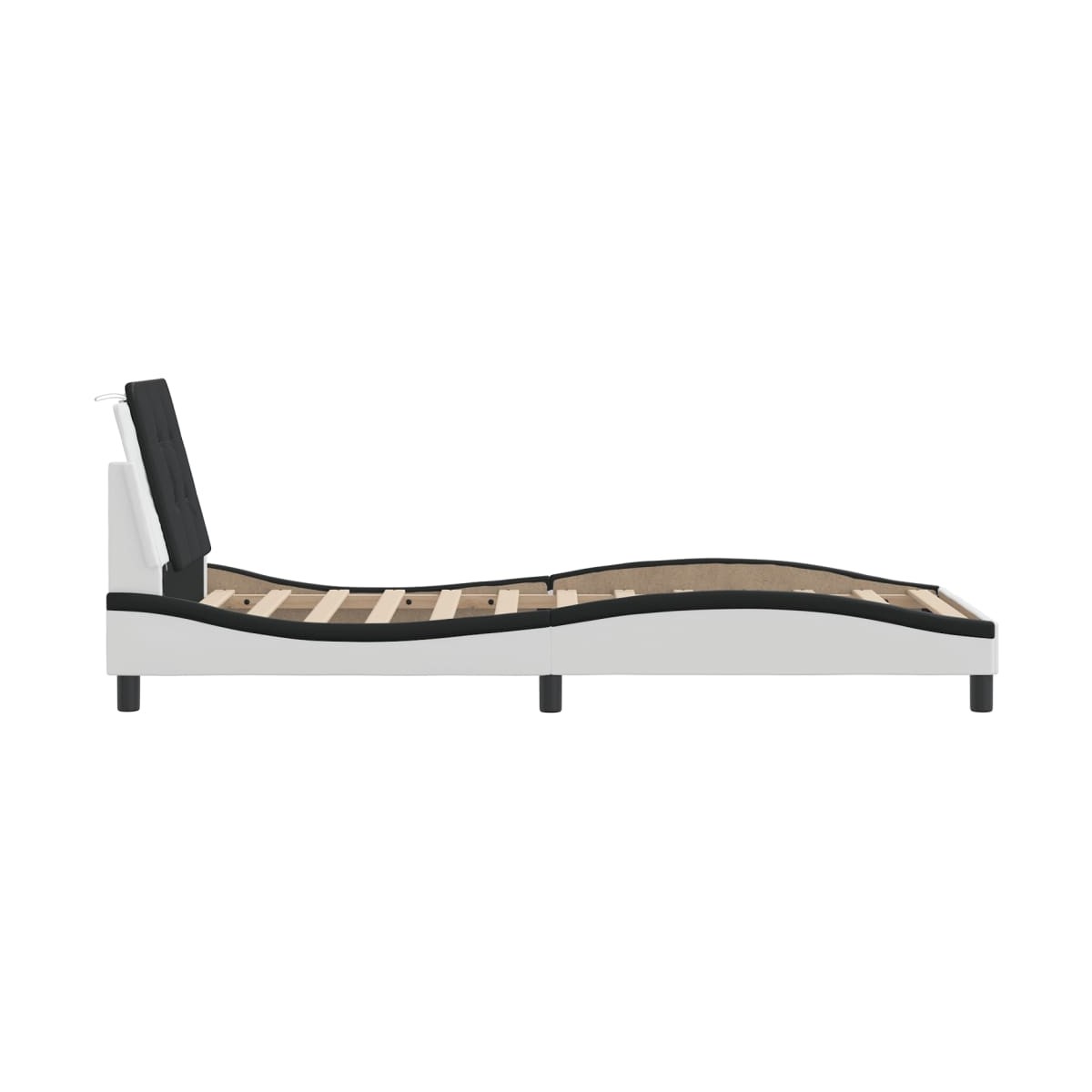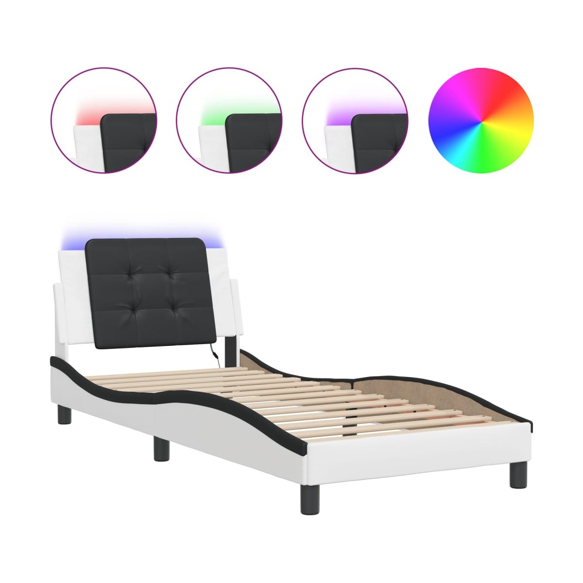 ¡Consigue tener un sueño reparador con esta estructura de cama con luces LED! Es un aporte acogedor para cualquier dormitorio. Material duradero: El cuero sintético de primera calidad es un material muy duradero. Es resistente a las manchas, por lo que es fácil de limpiar con un paño húmedo. Además, la superficie lisa da un aspecto lujoso y la belleza del cuero auténtico.Listones robustos: Los listones de madera contrachapada proporcionan una buena distribución del peso, lo que garantiza que el colchón se mantenga en tu sitio con cada giro y vuelta del cuerpo mientras duermes.Excelente apoyo: El cabecero de la cama te proporciona un excelente apoyo para la espalda mientras estás sentado en la cama para leer o ver la televisión.Tira de LED de colores: Alegra la oscuridad con luces LED de colores. Los cierres de gancho y bucle de la parte posterior del cojín del cabecero se pueden utilizar para fijar las luces LED.Diseño lateral ondulado: El look ondulado de la estructura de la cama es elegante y sofisticado, agregando un toque moderno y elegante a tu decoración, convirtiéndolo en el foco de atención de tu dormitorio. Información útil:El colchón no está incluido con la cama. Disponemos de una variada selección de colchones. Puedes echar un vistazo a nuestra tienda para buscar el colchón correspondiente.El producto tiene un conector USB que necesita una fuente de alimentación USB certificada de 5 V (no incluida).