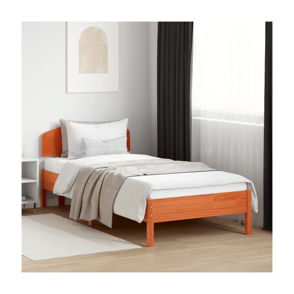 ¡Disfruta de una buena noche de sueño en esta estructura de cama de madera! Es un aporte práctico y decorativo para la casa. Material duradero: La madera maciza de pino es un hermoso material natural. La madera de pino tiene vetas rectas, y los nudos dan al material su distintivo aspecto rústico. Hecha de madera maciza de pino, esta cama es resistente y duradera. Listones de madera contrachapada: Los listones de madera contrachapada ofrecen una buena distribución del peso, lo que garantiza el tan necesario soporte y la transpirabilidad del colchón. Excelente soporte: El cabecero de cama de madera te ofrece un excelente soporte para la espalda cuando te sientas en la cama para leer o mirar la televisión. Información útil:El colchón no está incluido con la cama. Disponemos de una variada selección de colchones. Puedes echar un vistazo a nuestra tienda para buscar el colchón correspondiente.