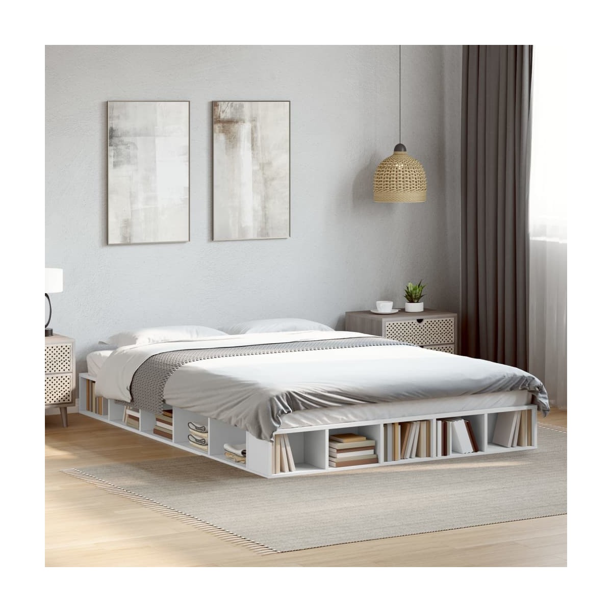 Consigue un sueño más reparador con esta estructura de cama. Es un aporte acogedor para cualquier dormitorio. Material duradero: La estructura de la cama está hecha de madera de ingeniería. La madera de ingeniería tiene una calidad excepcional, con una superficie lisa y también con fuerza, estabilidad y resistencia a la humedad.Listones para un soporte óptimo: El somier se completa con listones para ofrecer un soporte esencial y transpirabilidad a tu colchón.Función de almacenamiento: Este somier ofrece compartimentos abiertos para mantener tus revistas, libros, juguetes y otros objetos pequeños bien organizados. Información útil:El colchón no está incluido con la cama. Disponemos de una variada selección de colchones. Puedes echar un vistazo a nuestra tienda para buscar el colchón correspondiente.