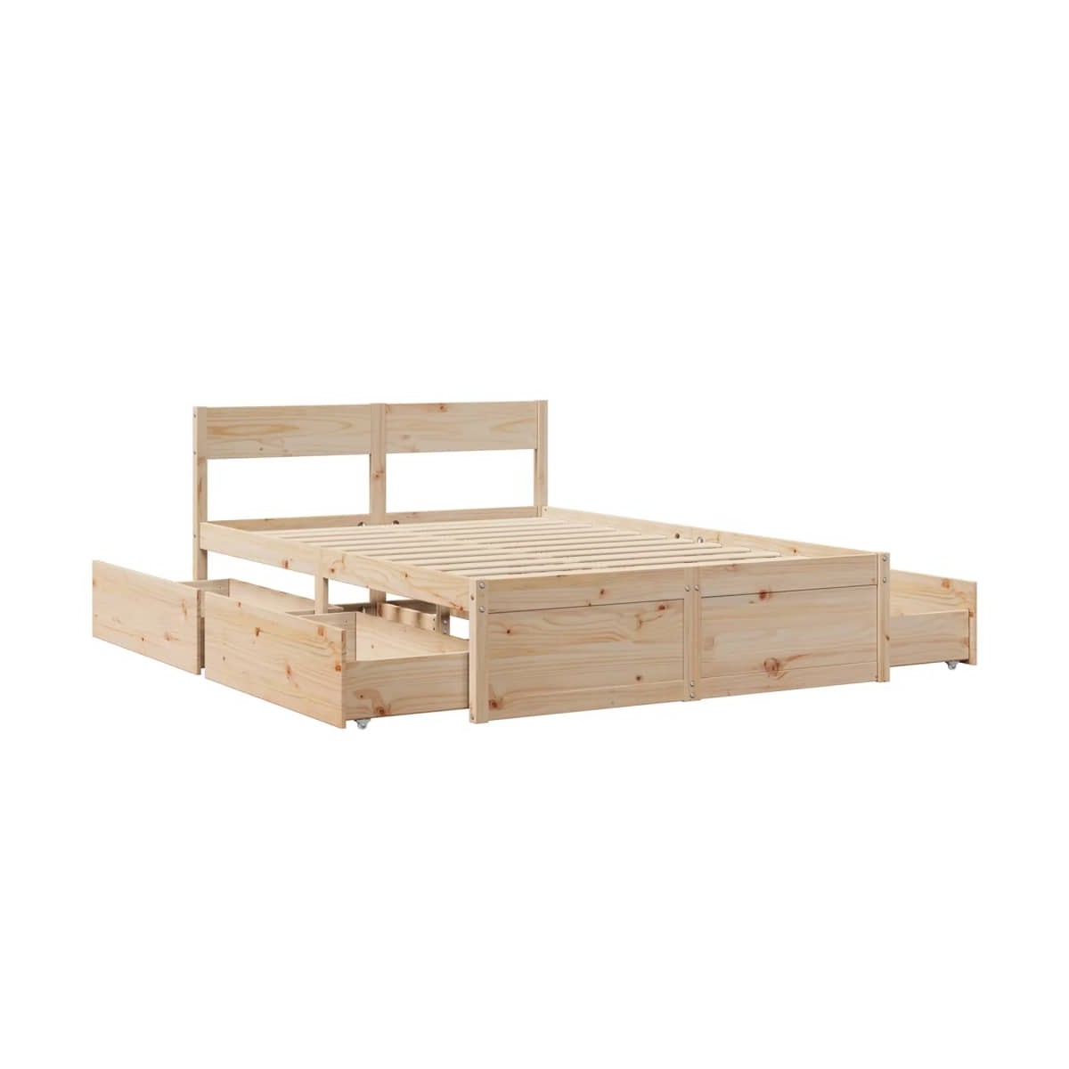 ¡Añade un toque moderno a tu dormitorio con esta estructura de cama con cajones! Es un aporte práctico y decorativo para tu hogar. Estructura estable y duradera: La madera de pino maciza es conocida por su resistencia y durabilidad. Sus vetas rectas y sus característicos nudos contribuyen a su encanto rústico.Listones robustos: Los listones de madera contrachapada proporcionan una buena distribución del peso, lo que garantiza que el colchón se mantenga en tu sitio con cada giro y vuelta del cuerpo mientras duermes.Función de almacenaje: Los cajones de cama incluidos proporcionan amplio espacio de almacenamiento para guardar cosas básicas, y mantienen la habitación limpia y ordenada.Cabecero versátil: Esta estructura de cama viene con un cabecero que proporciona un excelente soporte para la espalda cuando te sientas en la cama para leer o ver la televisión, a la vez que sirve como elemento decorativo. Información útil:El colchón no está incluido con la cama. Disponemos de una variada selección de colchones. Puedes echar un vistazo a nuestra tienda para buscar el colchón correspondiente.