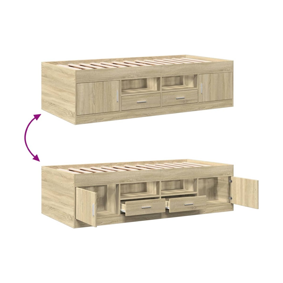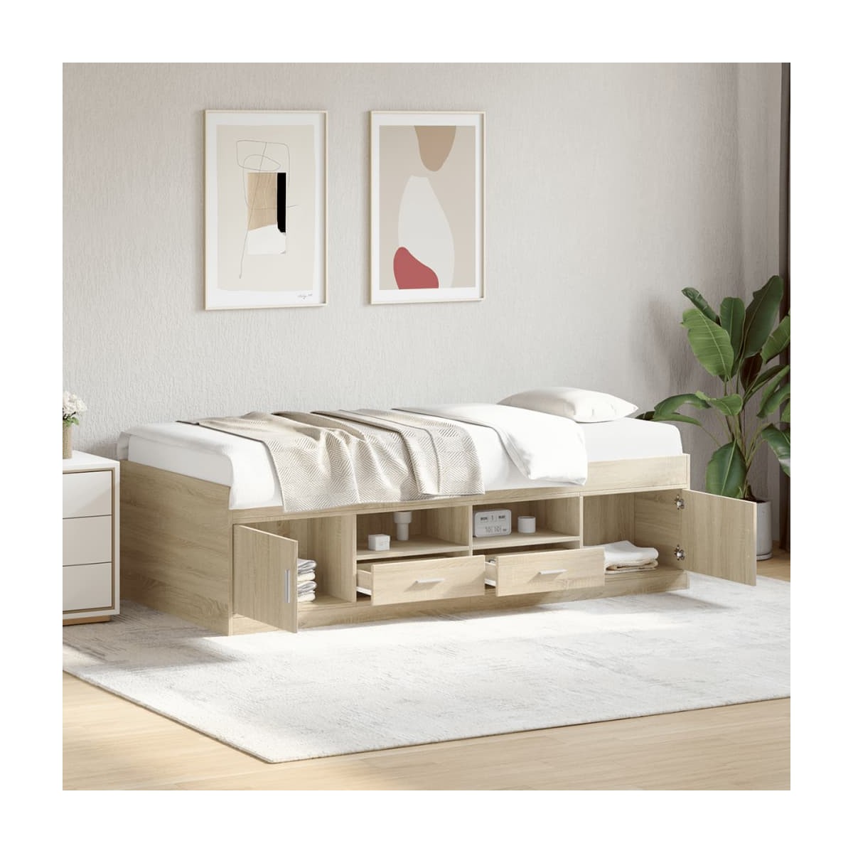 Este versátil sofá cama se puede utilizar no solo como cama en el dormitorio, sino también como sofá en el salón. Se adaptará perfectamente a sus diferentes necesidades, proporcionándole mucho espacio para dormir o descansar. Sólida construcción: Este sofá cama tiene una estructura robusta de madera de ingeniería. La madera de ingeniería es de una calidad excepcional con una superficie lisa y cuenta con la fuerza, la estabilidad y la resistencia a la humedad.Función de almacenaje: Los cajones de cama incluidos proporcionan amplio espacio de almacenamiento para guardar cosas básicas, y mantienen la habitación limpia y ordenada.Listones robustos: Los listones de madera contrachapada proporcionan una buena distribución del peso, lo que garantiza que el colchón se mantenga en tu sitio con cada giro y vuelta del cuerpo mientras duermes. Información útil:El colchón no está incluido con la cama. Disponemos de una variada selección de colchones. Puedes echar un vistazo a nuestra tienda para buscar el colchón correspondiente.