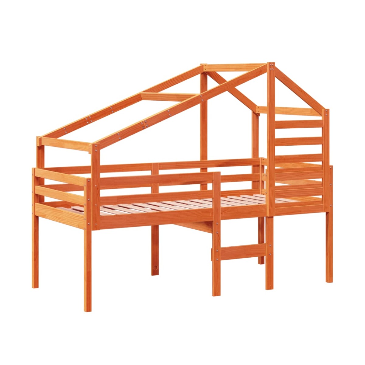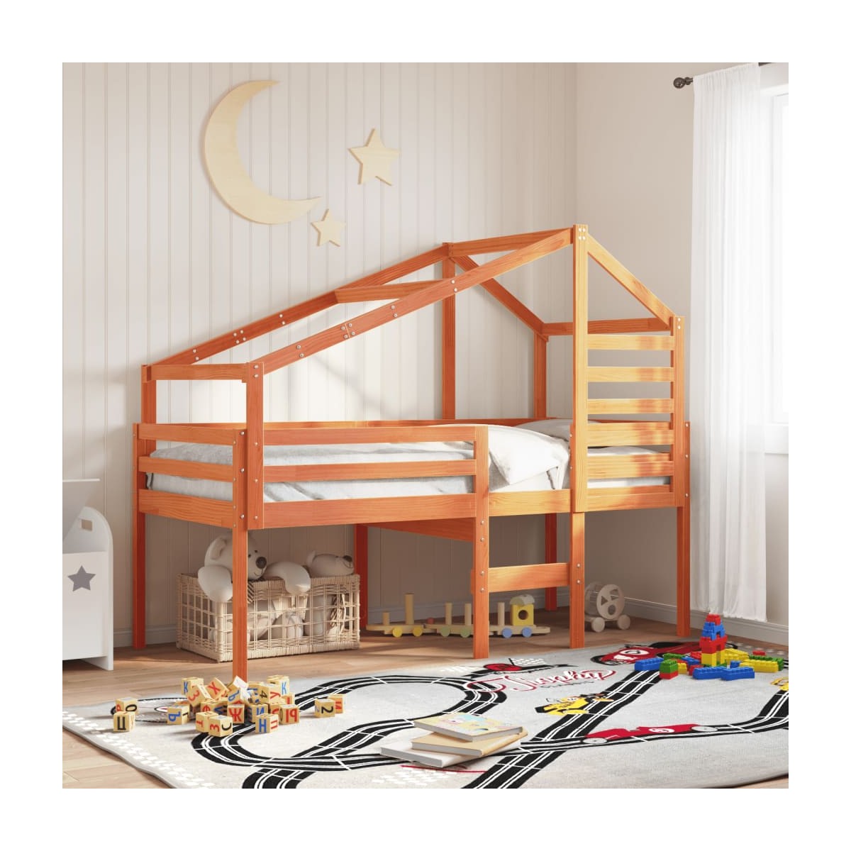 Esta cama alta, con la versatilidad en el corazón de su diseño, es una combinación perfecta de estilo elegante y moderno y practicidad. Es ideal para habitaciones pequeñas. Madera de pino maciza: La madera de pino maciza es un bonito material natural. La madera de pino tiene vetas rectas, y los nudos dan al material su distintivo aspecto rústico.Función práctica: La cama alta ofrece una gran manera de utilizar el espacio del suelo en el dormitorio de tu hijo, puedes combinarla con una cortina de juego genial, un colchón de juego y un panel de cobertizo como rincón de juego o utilizar el área de abajo para el almacenamiento. Los listones de madera contrachapada proporcionan un soporte adicional para la cama. Extiende la vida útil del colchón al absorber la mayor parte del estrés y el peso en la cama.Diseño seguro: La escalera incorporada en la cama alta facilita la subida y bajada de la cama, y las barandillas garantizan la seguridad de los más pequeños mientras duermen.Gran diversión: Al combinar el techo con la cama de tu hijo, puedes crear un escondite que le ofrezca a tu hijo mucha diversión a la hora de acostarse. Este innovador añadido al cuarto no solo será un punto emocionante, sino que también traerá asombro y emoción a la habitación de los niños.Puerta lateral abierta: El techo cuenta con una puerta lateral abierta, lo que facilita el acceso para que tus hijos entren y salgan de la cama. Información útil:El colchón no está incluido con la cama. Disponemos de una variada selección de colchones. Puedes echar un vistazo a nuestra tienda para buscar el colchón correspondiente.