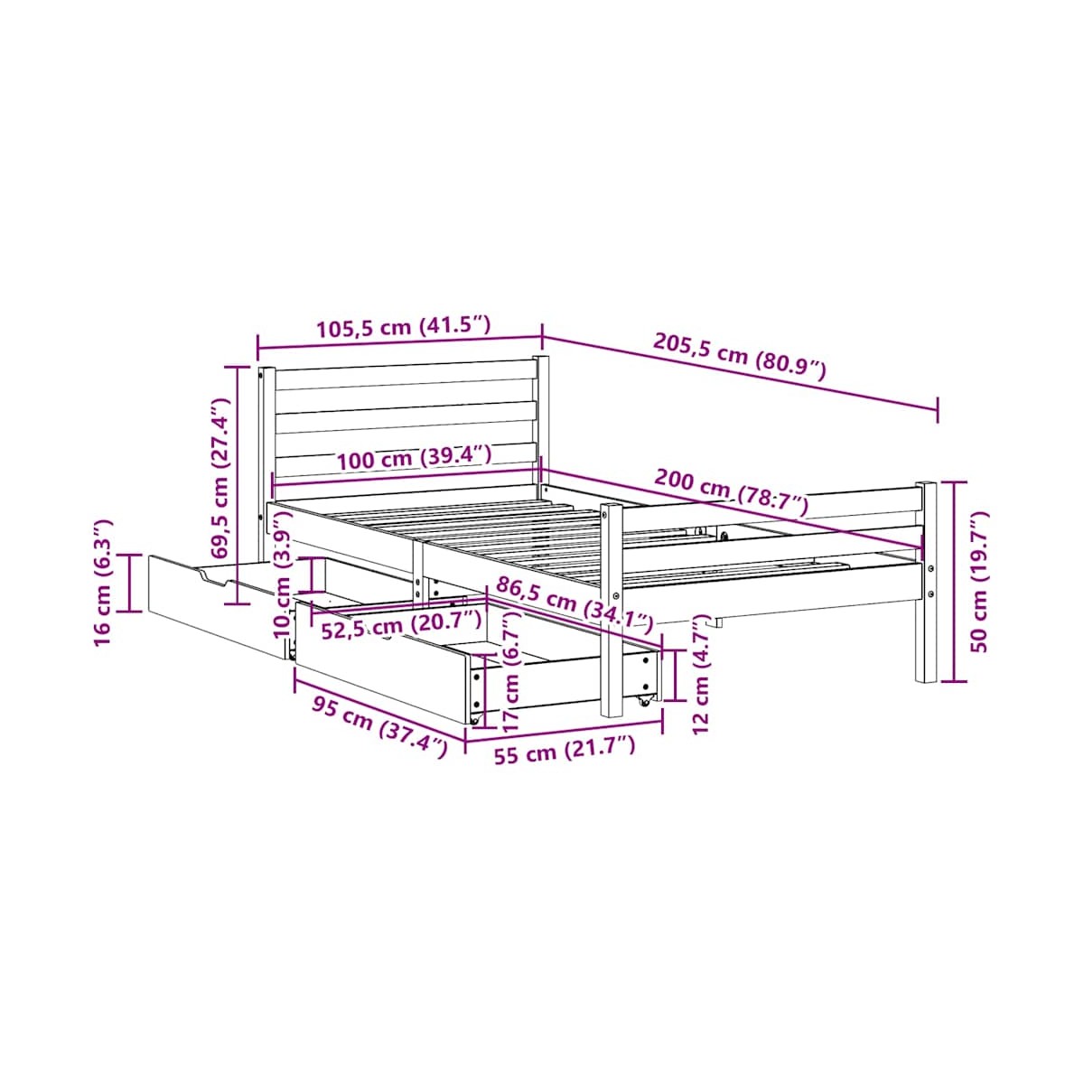 - Dimensiones de colchón compatible: 100 x 200 cm (ancho x largo) (colchón no incluido)