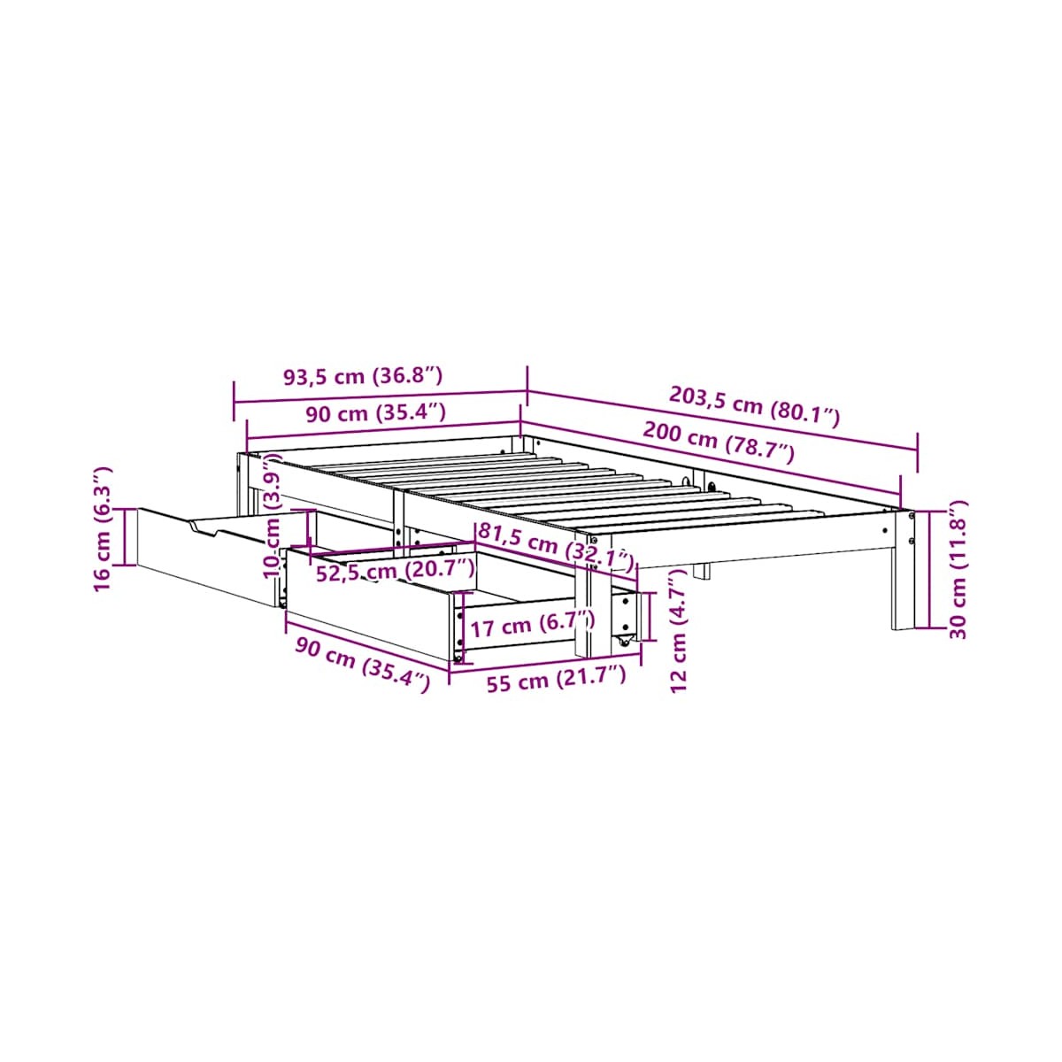Consigue un sueño más reparador con esta estructura de cama. Es un aporte acogedor para cualquier dormitorio. Estructura estable y duradera: La madera de pino maciza es conocida por su resistencia y durabilidad. Sus vetas rectas y sus característicos nudos contribuyen a su encanto rústico.Somier de láminas para un soporte óptimo: La estructura de cama está equipada con un somier de láminas para el apoyo y la transpirabilidad del colchón.Espacio de almacenamiento extra: Esta base de cama cuenta con dos cajones debajo, lo que proporciona almacenamiento para artículos como ropa de cama, ropa de temporada y juguetes.Maniobrabilidad sin esfuerzo: Este cajón de almacenamiento bajo la cama cuenta con cuatro ruedas, que proporcionan una maniobrabilidad suave y sin esfuerzo para deslizarse dentro y fuera de debajo de tu cama. Información útil:El colchón no está incluido con la cama. Disponemos de una variada selección de colchones. Puedes echar un vistazo a nuestra tienda para buscar el colchón correspondiente.