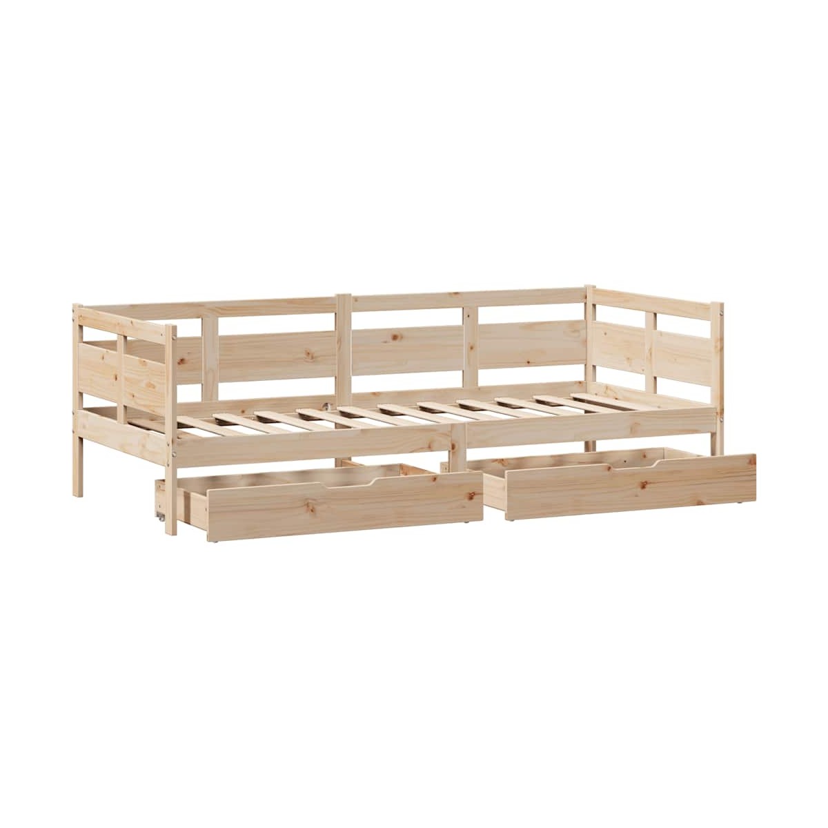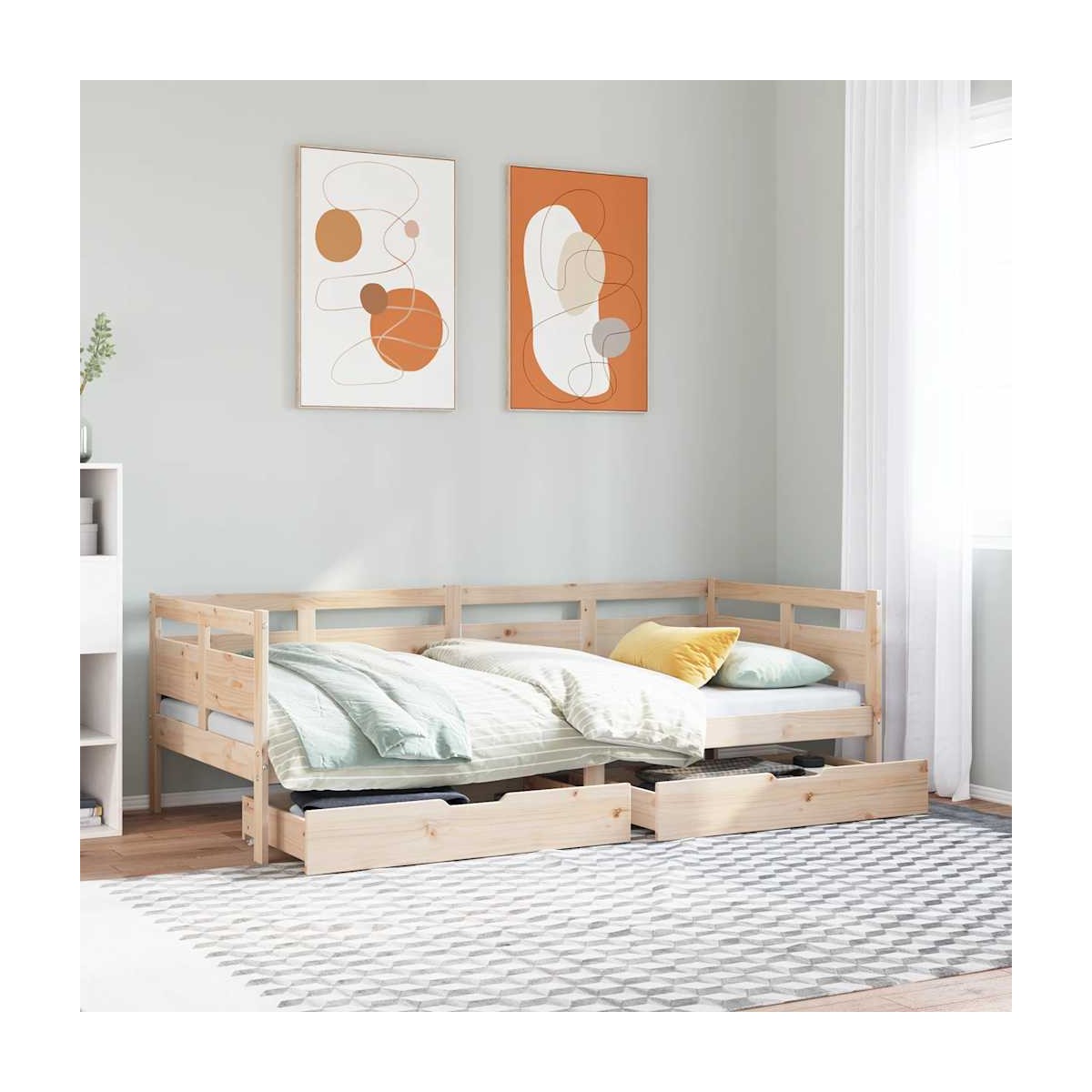 Este sofá cama 2 en 1 con cajones, que sirve como sofá y cama, es un complemento práctico y llamativo para tu salón o dormitorio. Estructura estable y duradera: La madera de pino maciza es conocida por su resistencia y durabilidad. Sus vetas rectas y sus característicos nudos contribuyen a su encanto rústico.Barreras de cama de 3 lados: Esta cama tiene un diseño único en el lateral de la cama, que proporciona una sensación de seguridad y además añade un toque de estilo sofisticado a tu hogar.Listones para un soporte óptimo: El sofá cama se completa con listones para ofrecer un soporte esencial y transpirabilidad a tu colchón.Encanto rústico: El sofá cama da a tu espacio matices rústicos que pueden ser realmente relajantes. El efecto calmante de este sofá cama de madera convierte cualquier dormitorio o habitación de invitados en un lugar relajante, al tiempo que añade un elemento natural a la habitación.Amplio espacio de almacenamiento: Esta cama de invitados tiene dos cajones que brindan un amplio espacio para guardar ropa, calcetines, juguetes, cojines, etc. Información útil:El colchón no está incluido con la cama. Ofrecemos una variada selección de colchones. Puedes echar un vistazo a nuestra tienda para buscar el correspondiente colchón.