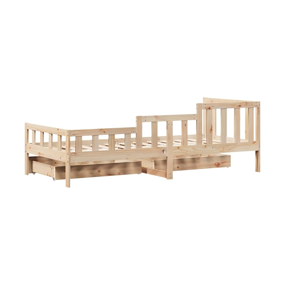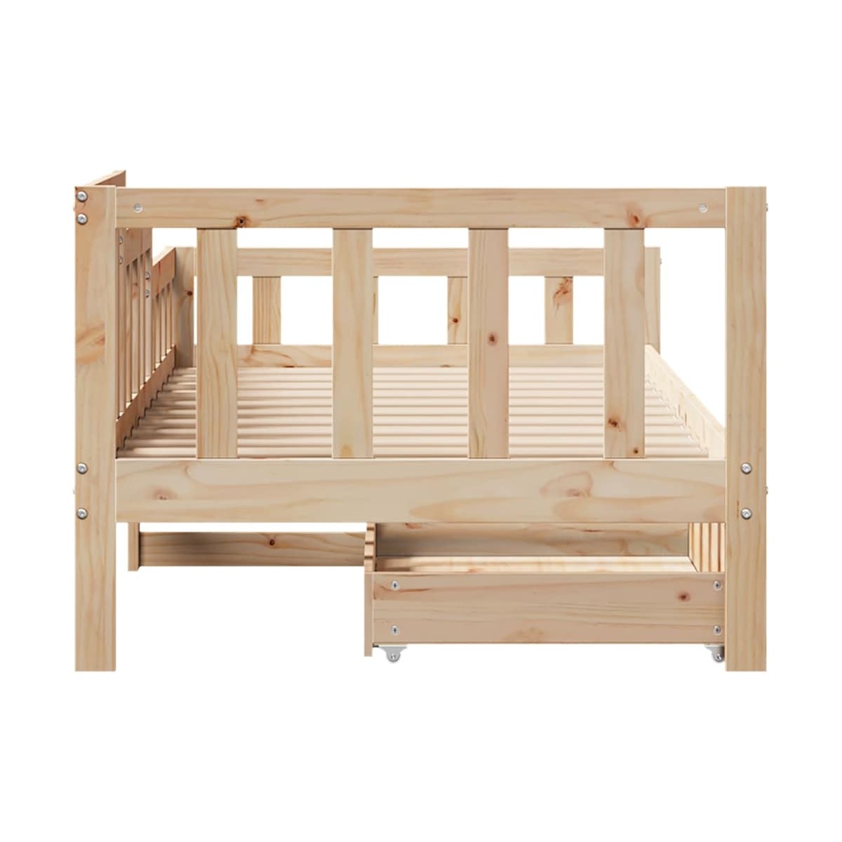 Este sofá cama 2 en 1 con cajones, que sirve como sofá y cama, es un complemento práctico y llamativo para tu salón o dormitorio. Estructura estable y duradera: La madera de pino maciza es conocida por su resistencia y durabilidad. Sus vetas rectas y sus característicos nudos contribuyen a su encanto rústico.Barreras de cama de 3 lados: Esta cama tiene un diseño único en el lateral de la cama, que proporciona una sensación de seguridad y además añade un toque de estilo sofisticado a tu hogar.Listones para un soporte óptimo: El sofá cama se completa con listones para ofrecer un soporte esencial y transpirabilidad a tu colchón.Encanto rústico: El sofá cama da a tu espacio matices rústicos que pueden ser realmente relajantes. El efecto calmante de este sofá cama de madera convierte cualquier dormitorio o habitación de invitados en un lugar relajante, al tiempo que añade un elemento natural a la habitación.Amplio espacio de almacenamiento: Esta cama de invitados tiene dos cajones que brindan un amplio espacio para guardar ropa, calcetines, juguetes, cojines, etc. Información útil:El colchón no está incluido con la cama. Ofrecemos una variada selección de colchones. Puedes echar un vistazo a nuestra tienda para buscar el correspondiente colchón.