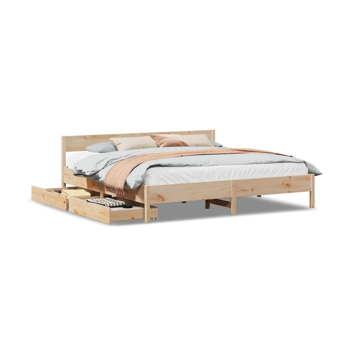 Consigue un sueño más reparador con esta estructura de cama. Es un aporte acogedor para cualquier dormitorio. Estructura estable y duradera: La madera de pino maciza es conocida por su resistencia y durabilidad. Sus vetas rectas y sus característicos nudos contribuyen a su encanto rústico.Somier de láminas para un soporte óptimo: La estructura de cama está equipada con un somier de láminas para el apoyo y la transpirabilidad del colchón.Cabecero versátil: Esta estructura de cama viene con un cabecero que proporciona un excelente soporte para la espalda cuando te sientas en la cama para leer o ver la televisión, a la vez que sirve como elemento decorativo.Aproveche al máximo el espacio: Este somier cuenta con dos cajones debajo, que proporcionan almacenamiento para artículos como ropa de cama extra, ropa de temporada y juguetes.Maniobrabilidad sin esfuerzo: Este cajón de almacenamiento bajo la cama cuenta con cuatro ruedas, que proporcionan una maniobrabilidad suave y sin esfuerzo para deslizarse dentro y fuera de debajo de tu cama. Información útil:El colchón no está incluido con la cama. Disponemos de una variada selección de colchones. Puedes echar un vistazo a nuestra tienda para buscar el colchón correspondiente.